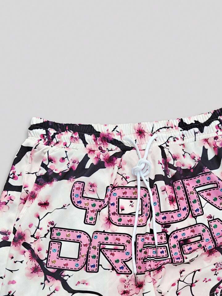 Street Life Damen Shorts mit Kirschblüten- und Buchstaben-Muster, minimalistisch und modisch, geeignet für den Sommer