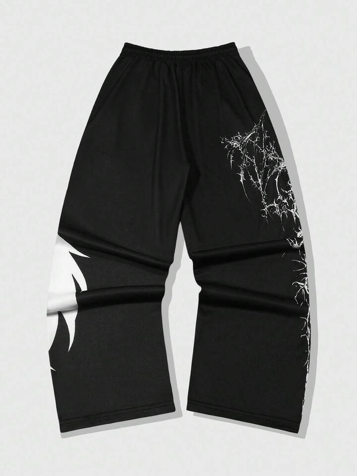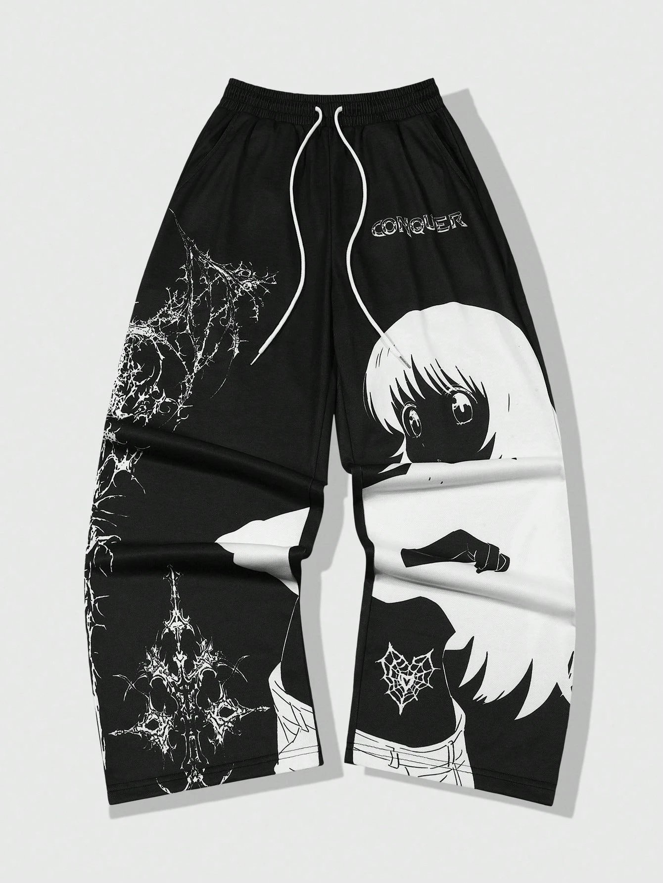 Street Life Herren Hose mit Cartoon-Charakterdruck, Kordelzug in der Taille, locker geschnitten, gerade Bein, säuregewaschene Optik, Herbst