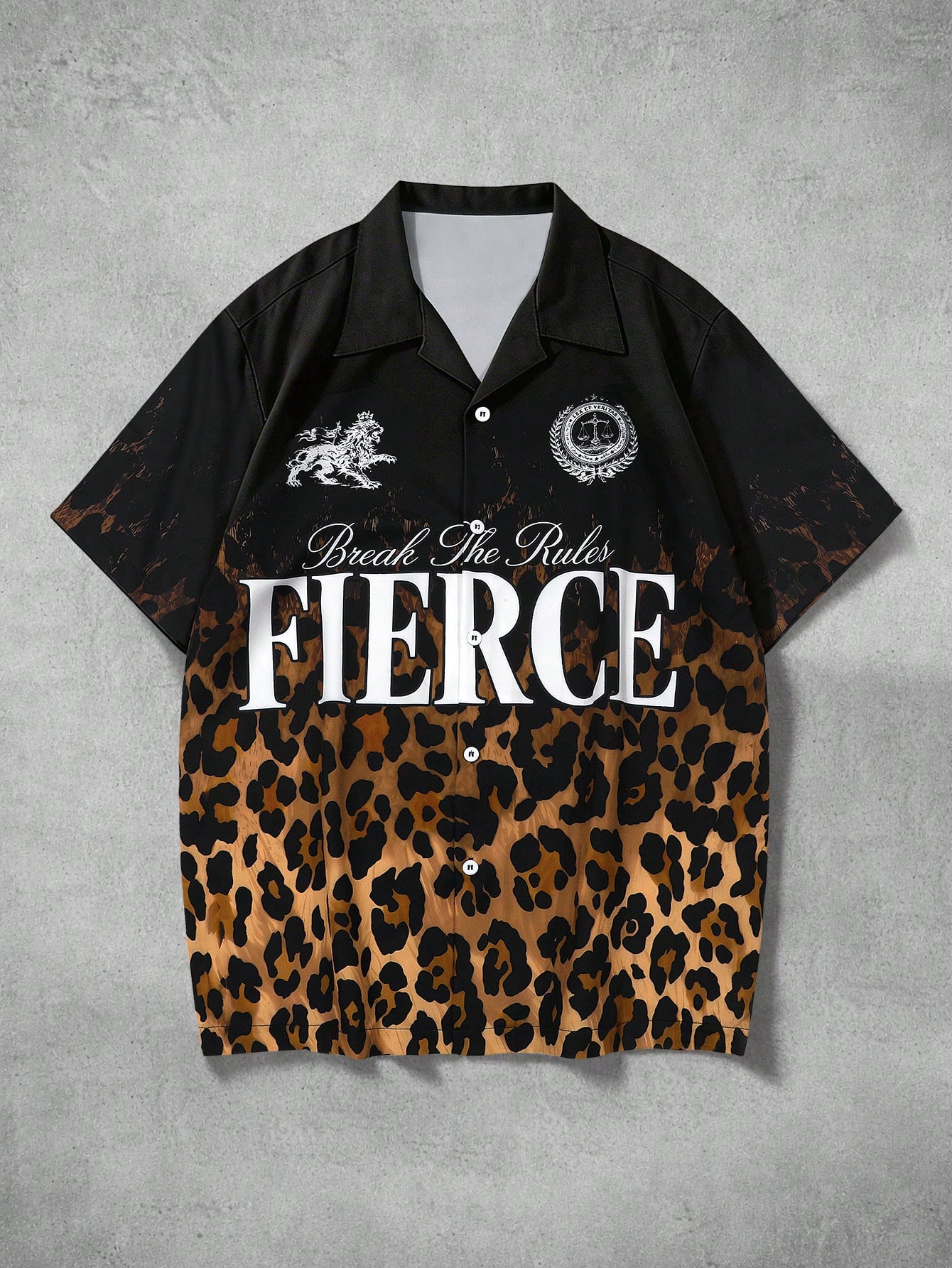 Street Life Herren Casual Farbverlauf Leoparden Muster Buchstaben Muster Knopfleiste Kurzarm Hemd, Sommer