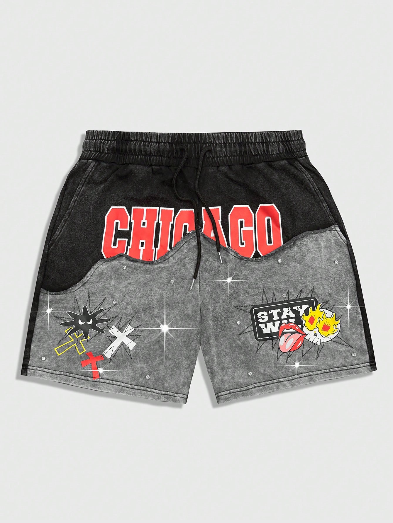 Street Life Herren lässige Straße Kreuz Buchstaben Muster Shorts mit Kordelzug Taille