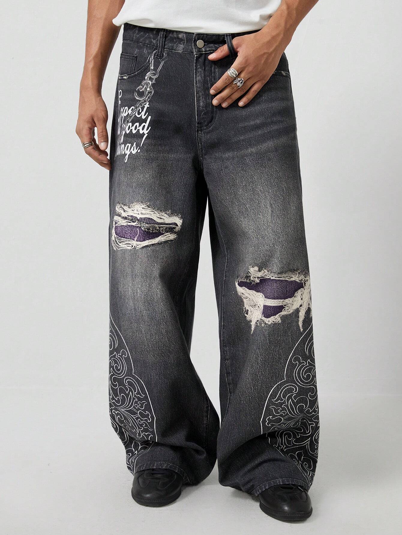 Street Life Herren modische Vintage Waschprint weite Schlupfhose Jeans