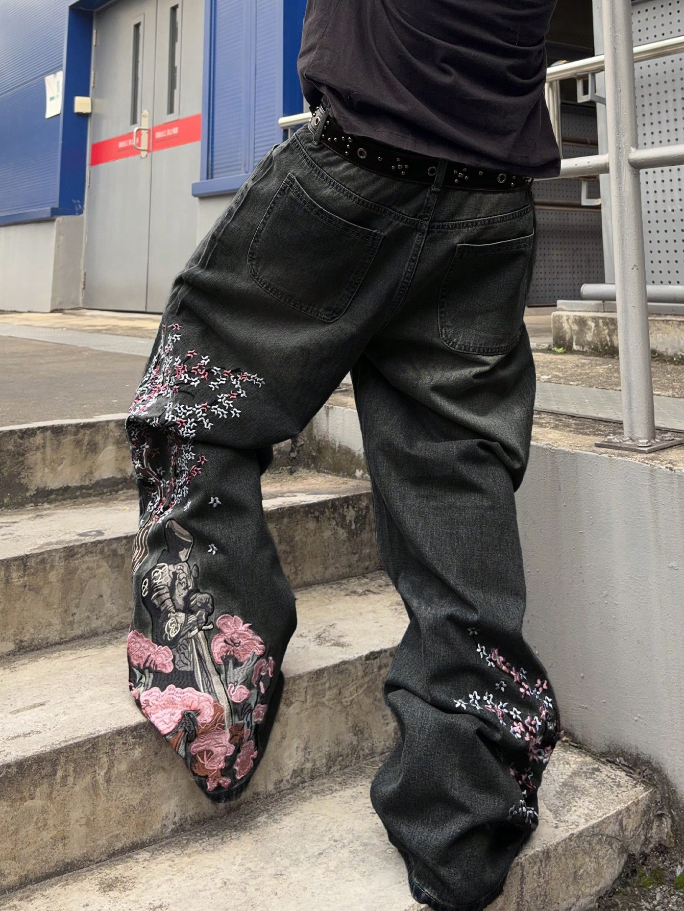 Street Life Herren Jeans mit locker sitzender Passform und floraler Stickerei