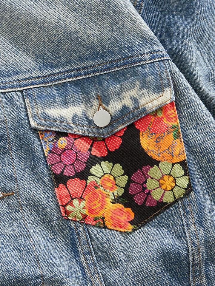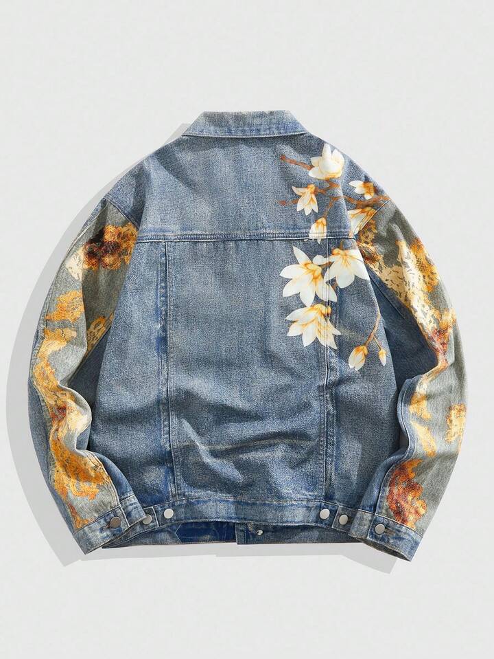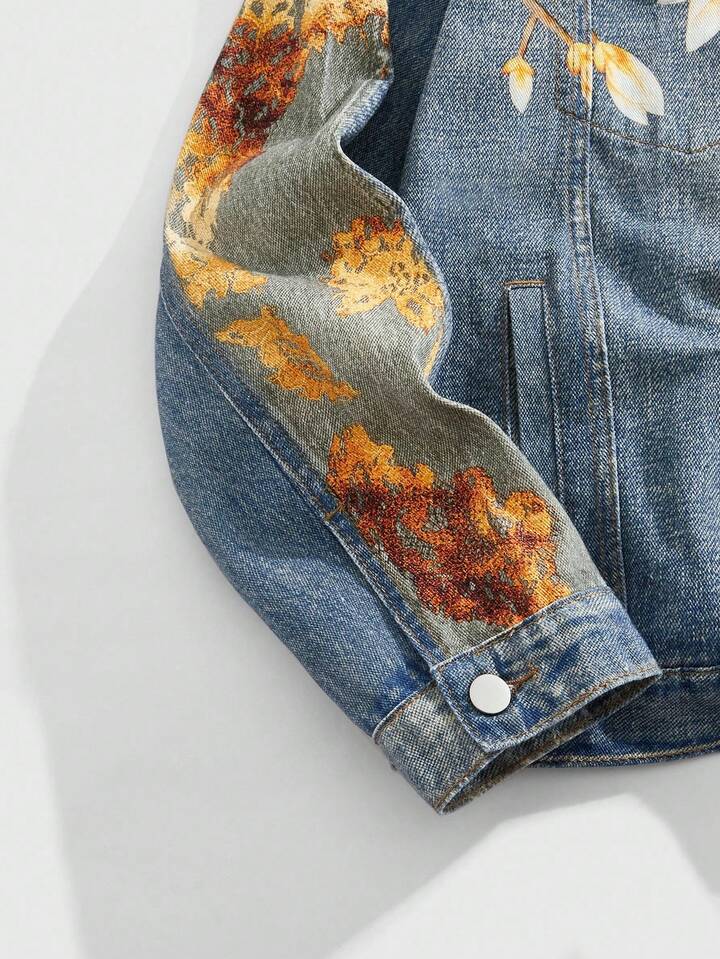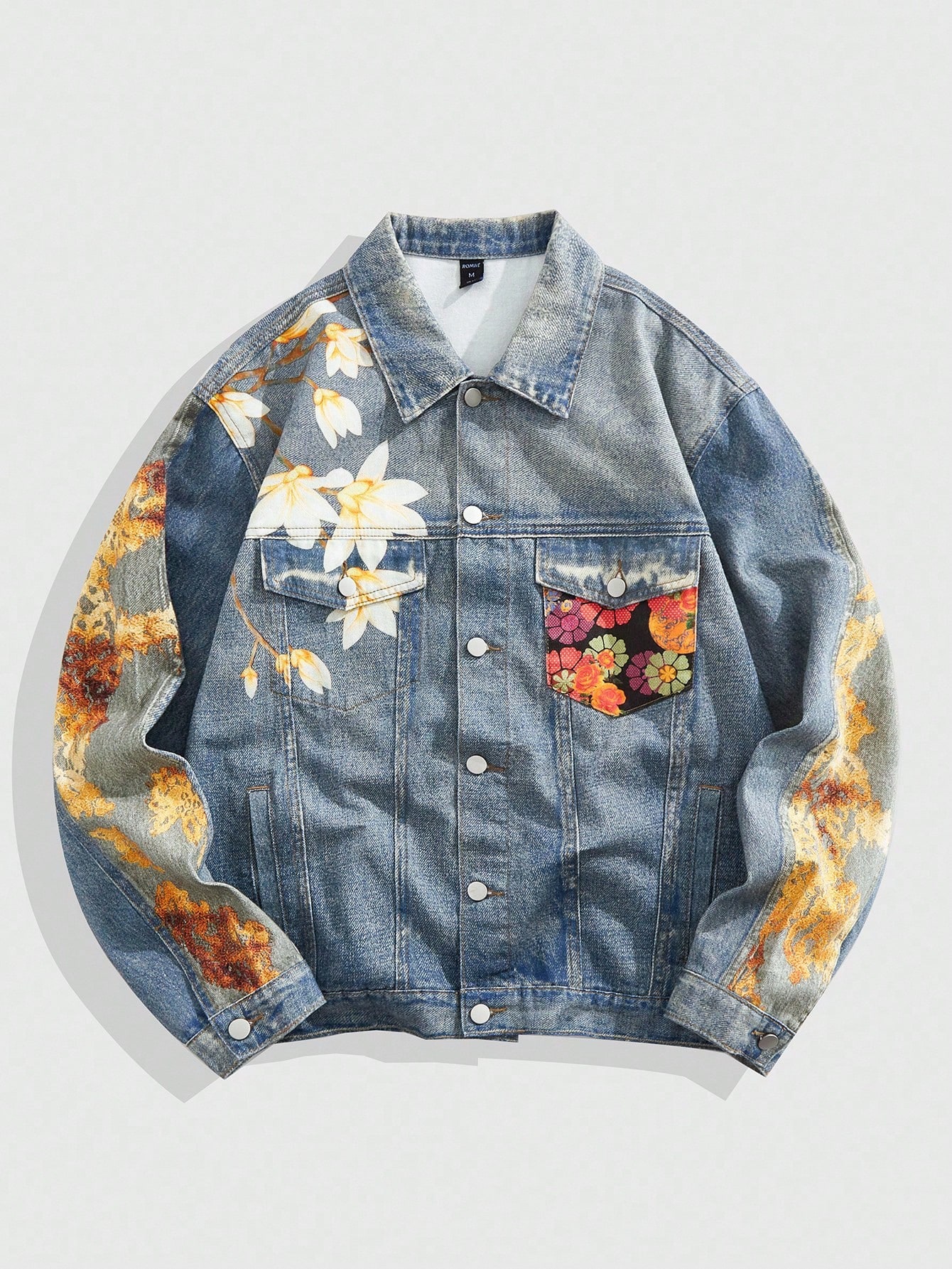 Street Life Herren Blume Muster Langarm Einreiher Lässig Denim Jacke, Herbst
