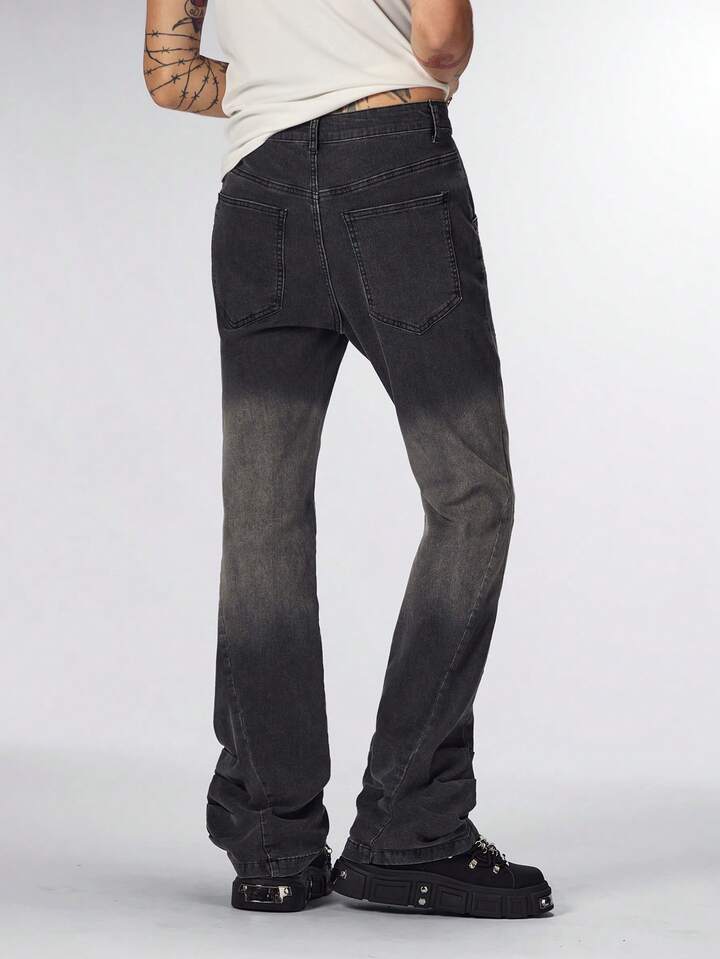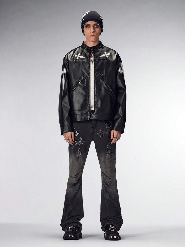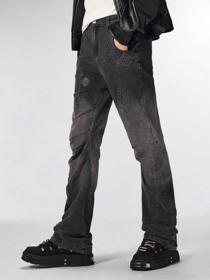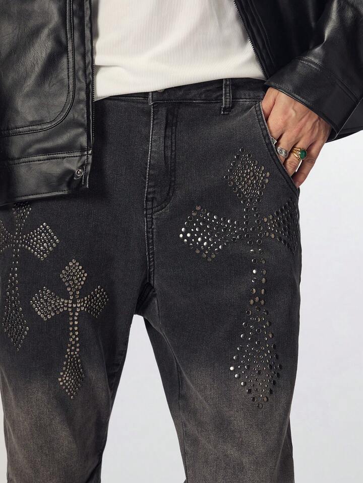 Street Life Herren Jeans mit hoher Taille, modischem Kreuz-Muster, Strass-Applikationen und weitem Bein