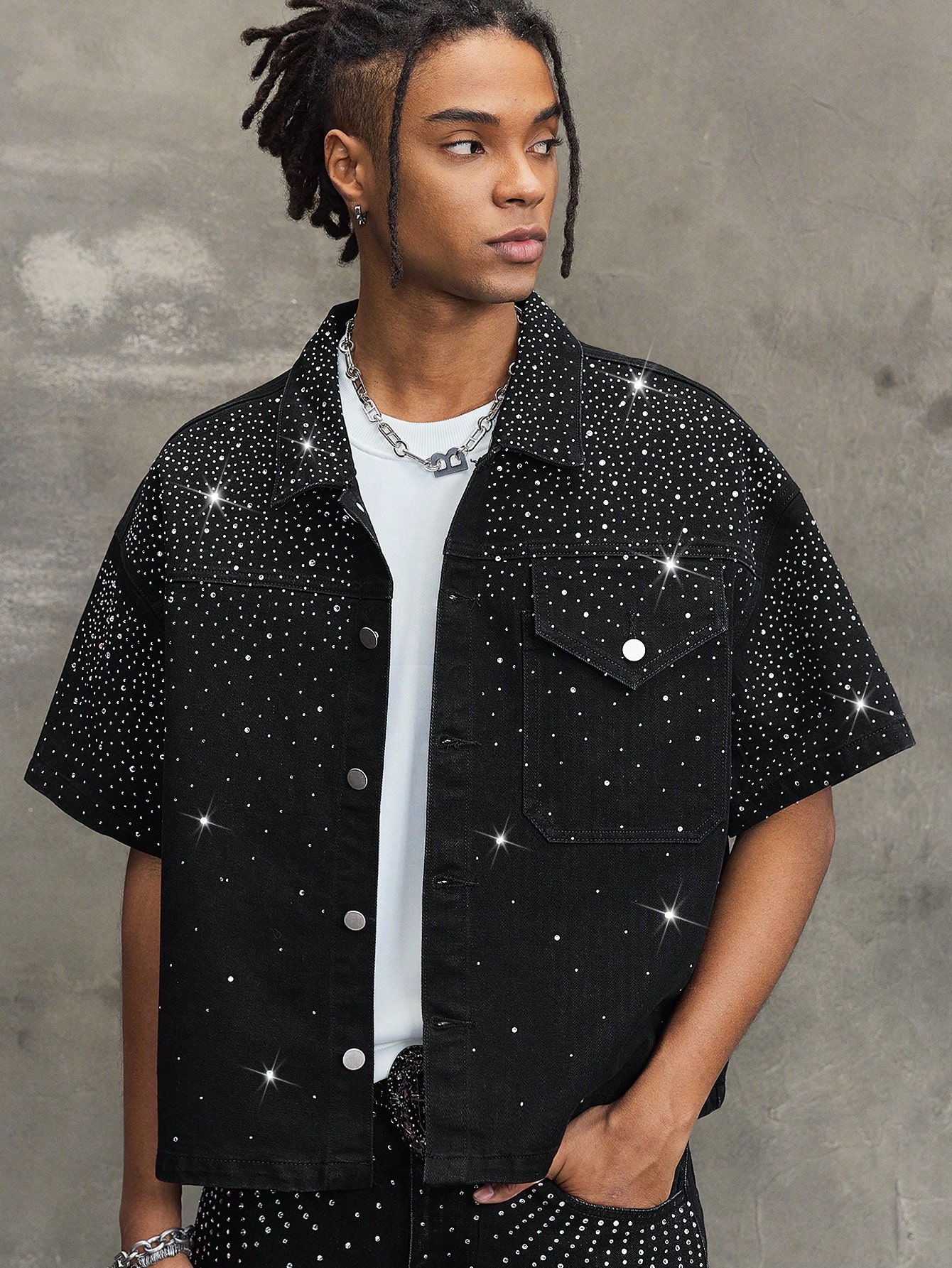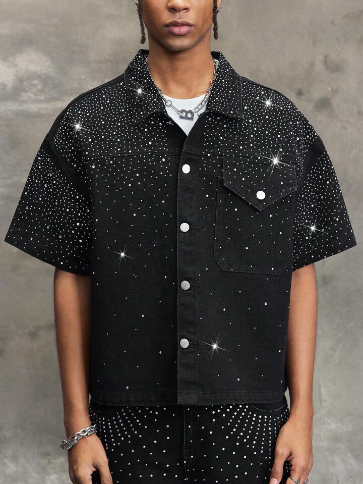 Street Life Herren lässiges Jeanshemden mit Strass-Verzierung, Einreiher, weit geschnitten
