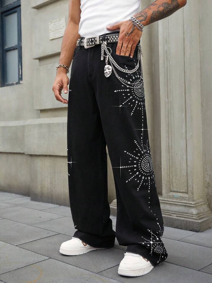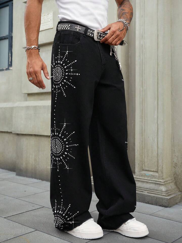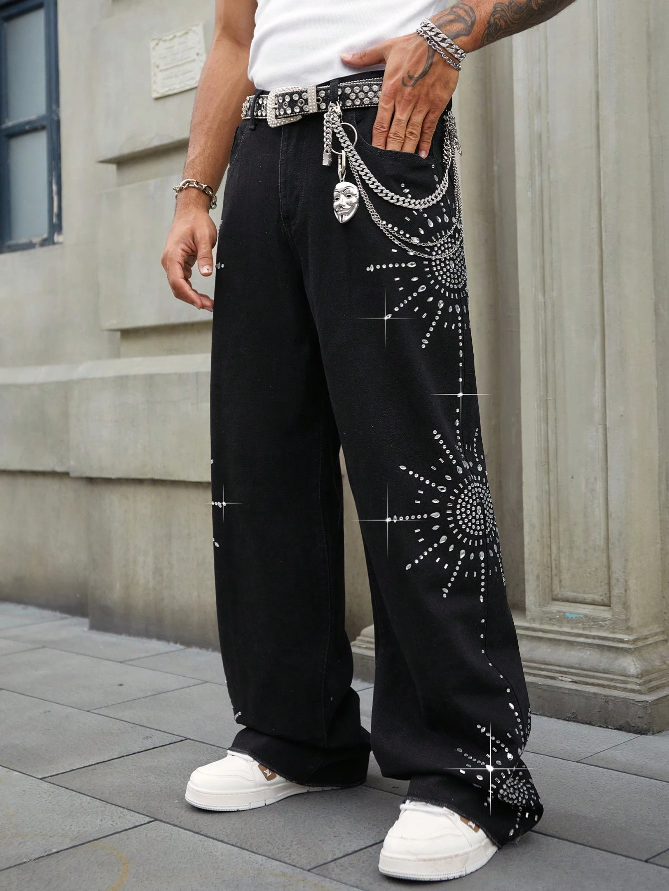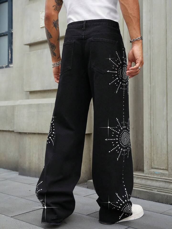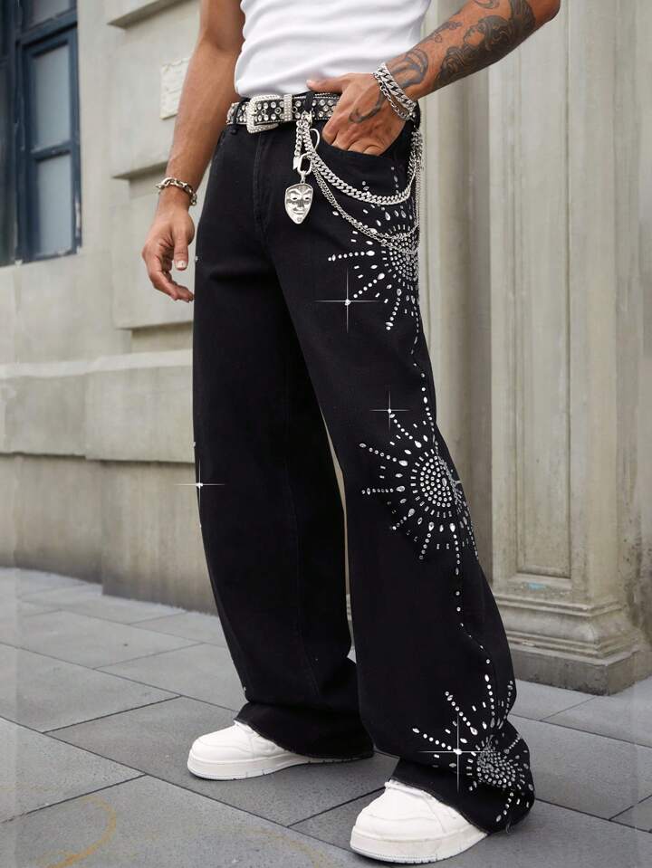 Street Life Herren Loose Fit Glitzer Strass Muster Baggy Jeans