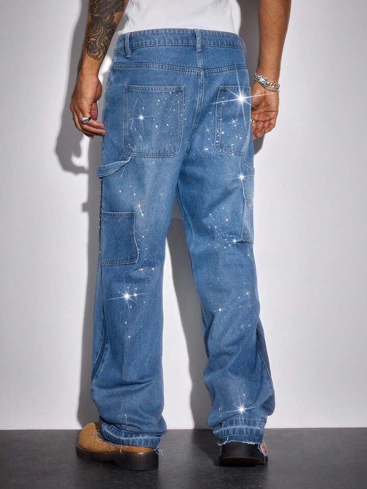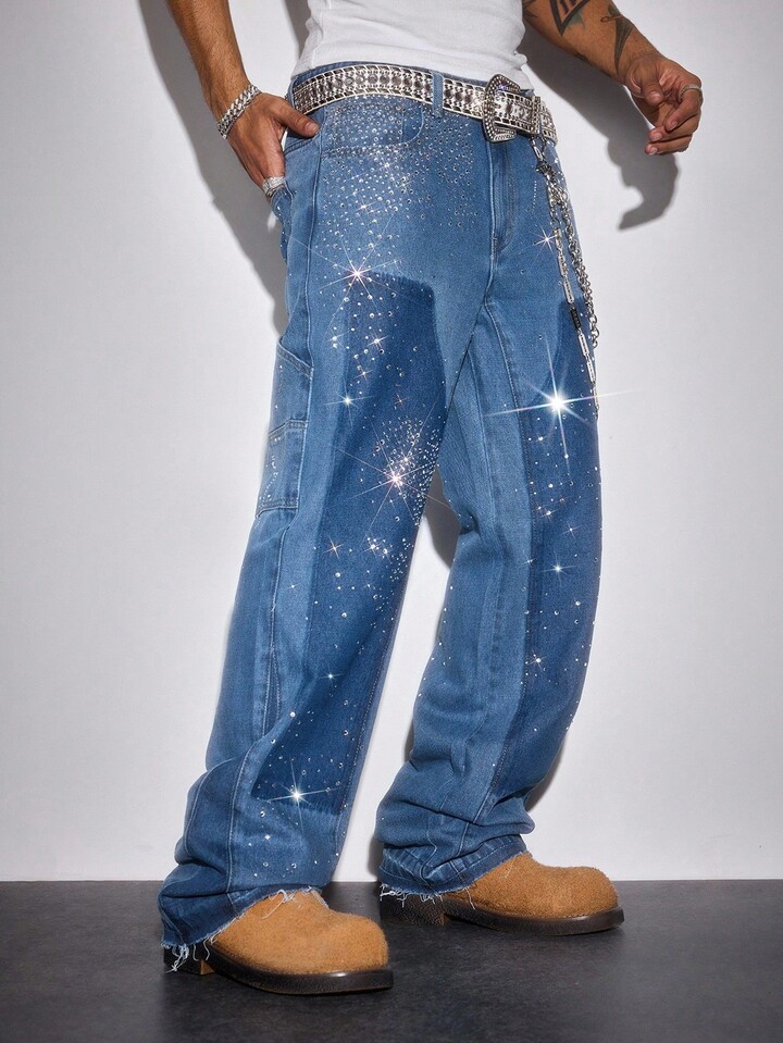 Street Life Herren Loose Fit Jeans mit Taschen, weitem Bein und Strass Verzierung