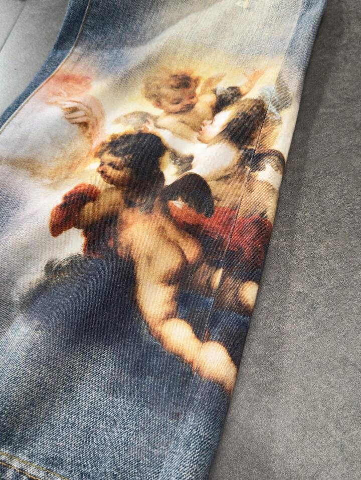 Street Life Herren Jeans mit weitem Bein und Engel-Grafik auf der Tasche, locker geschnitten