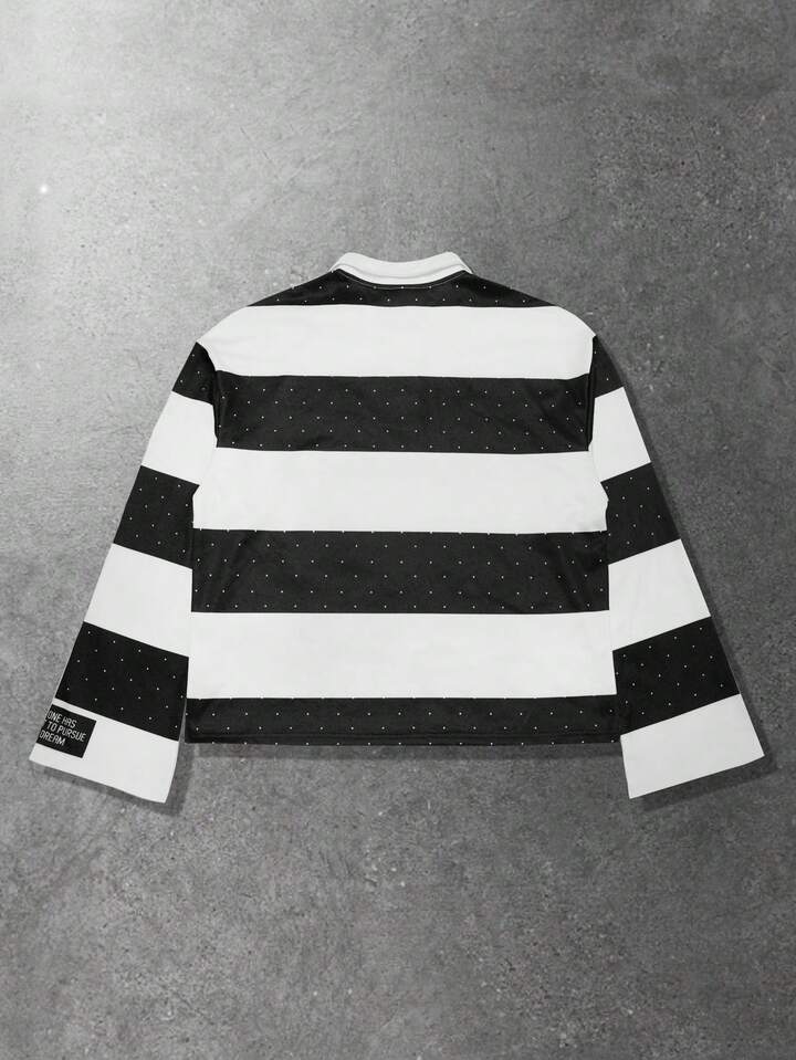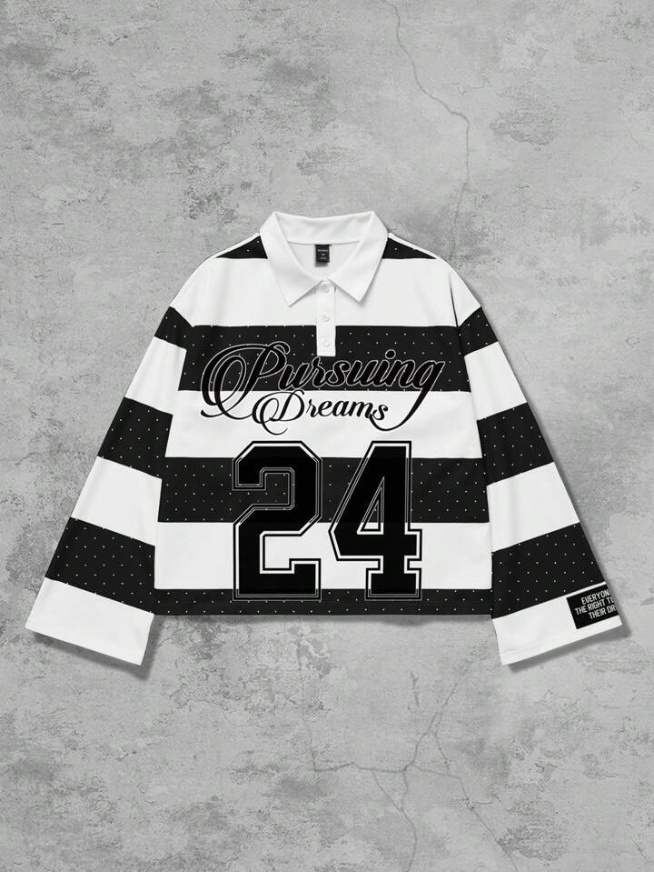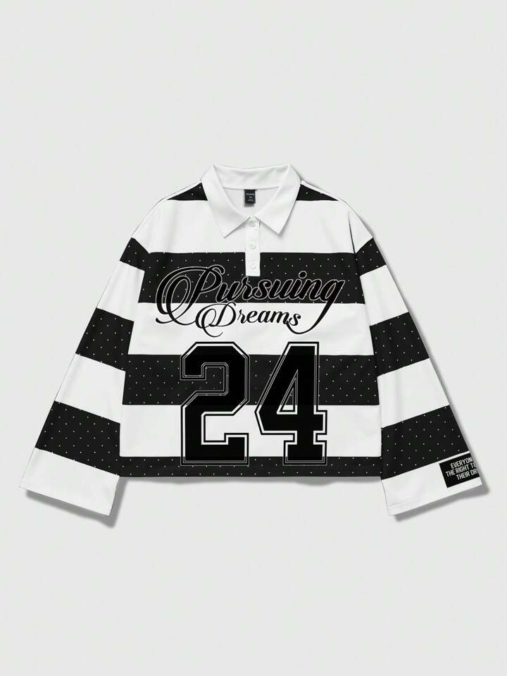 Street Life Herren gestreifter Kragen Langarm bedrucktes T-Shirt, lässiger College-Stil Top