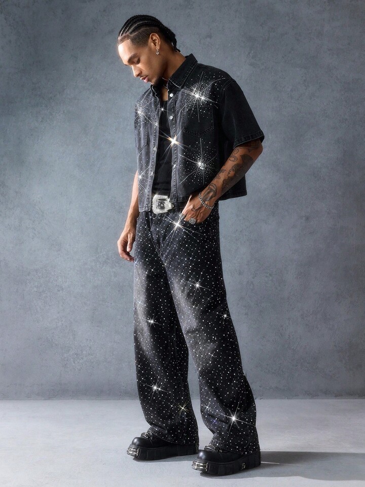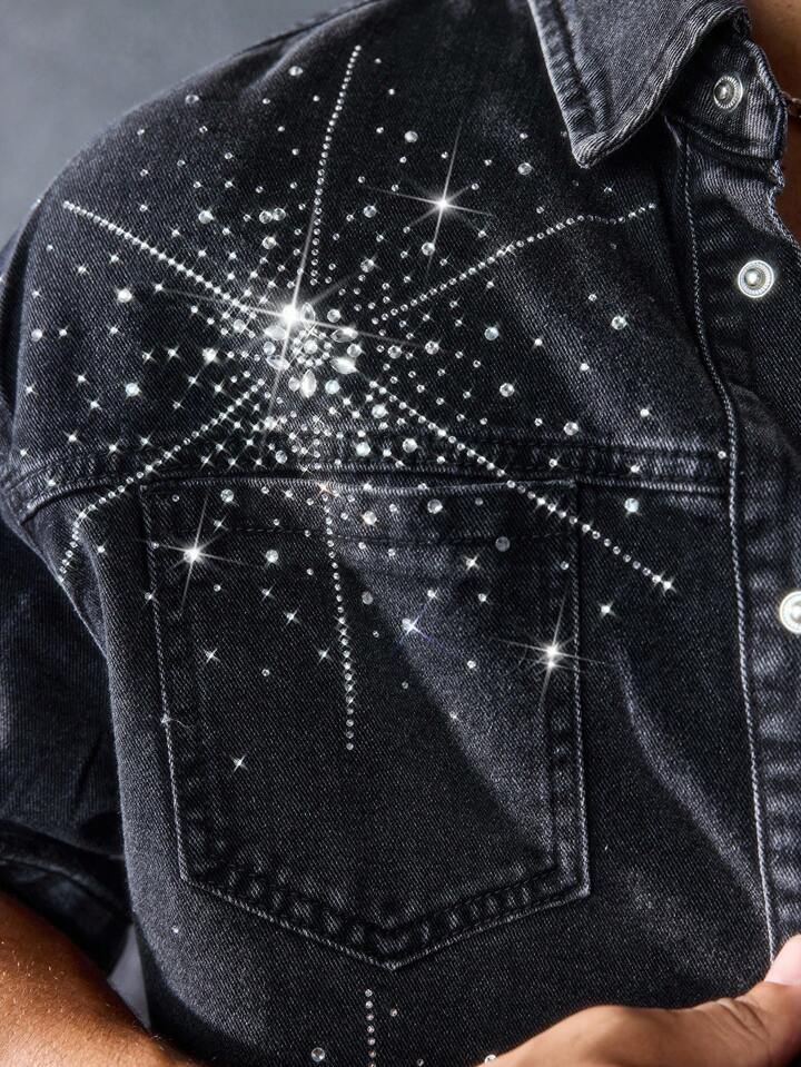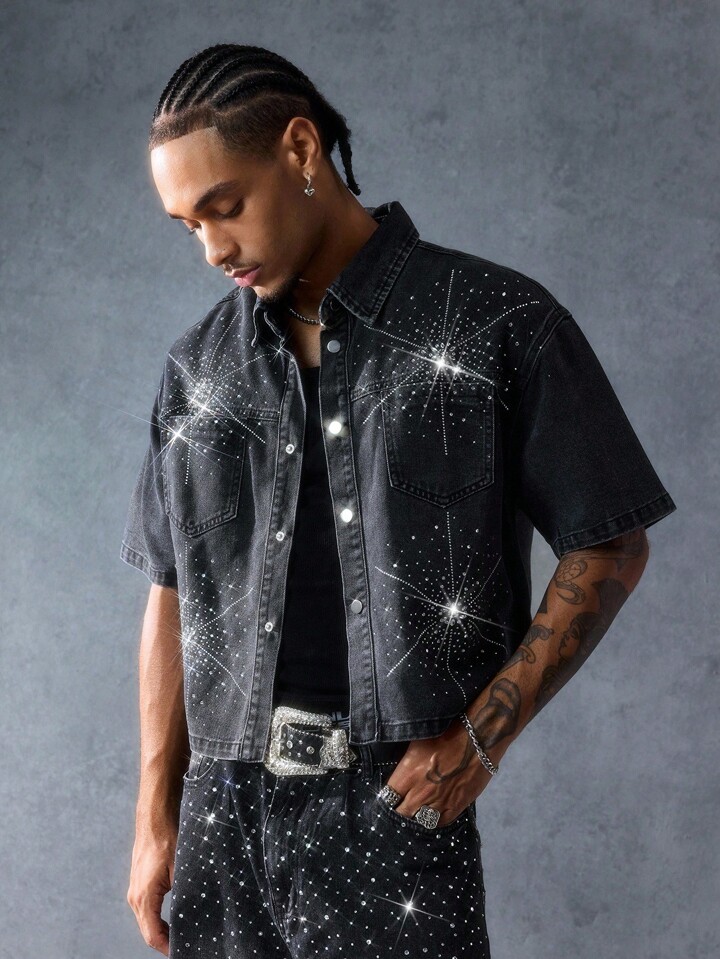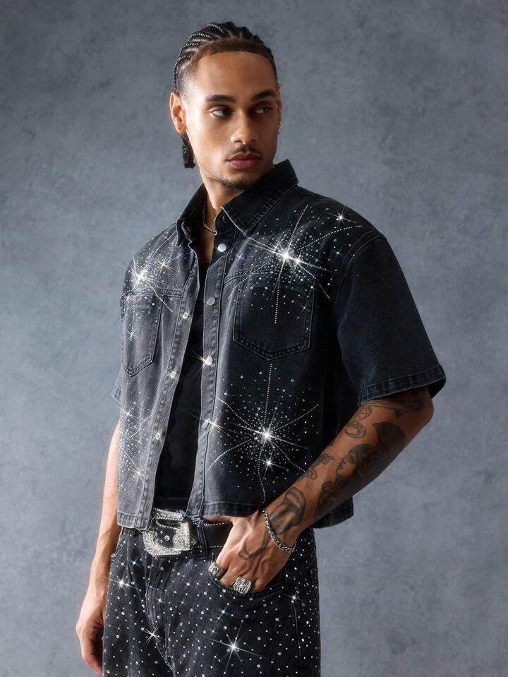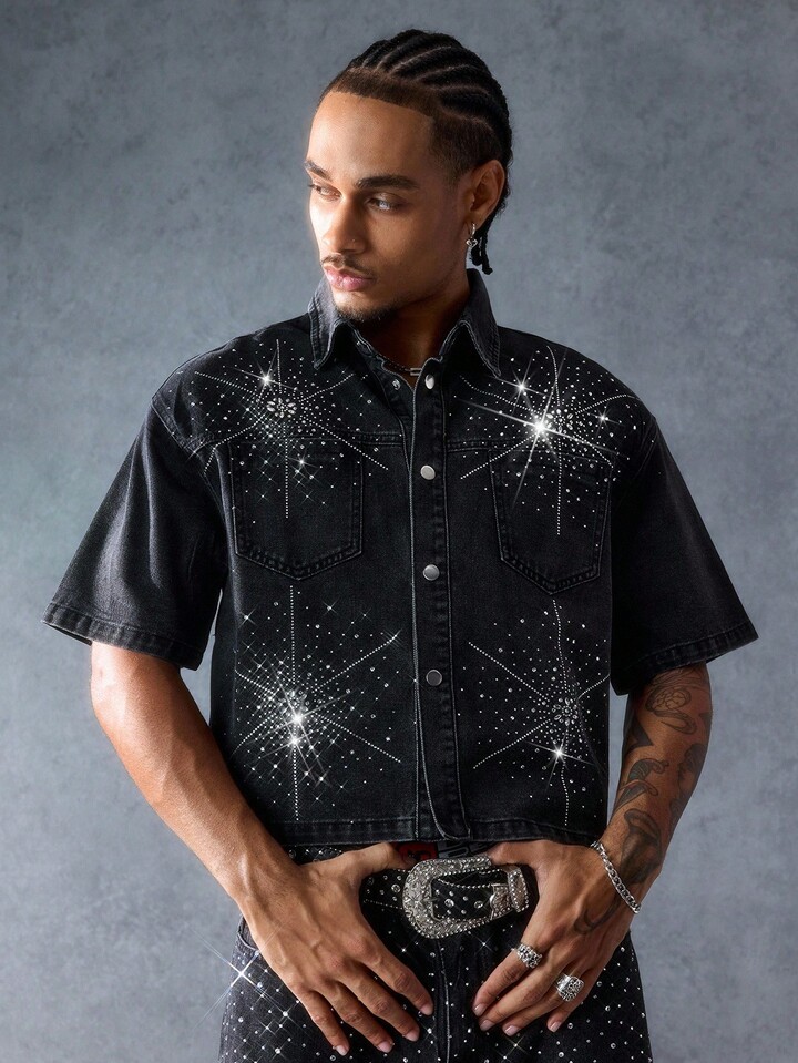 Street Life Herren Denim Hemd mit Strass-Verzierung, Einreiher