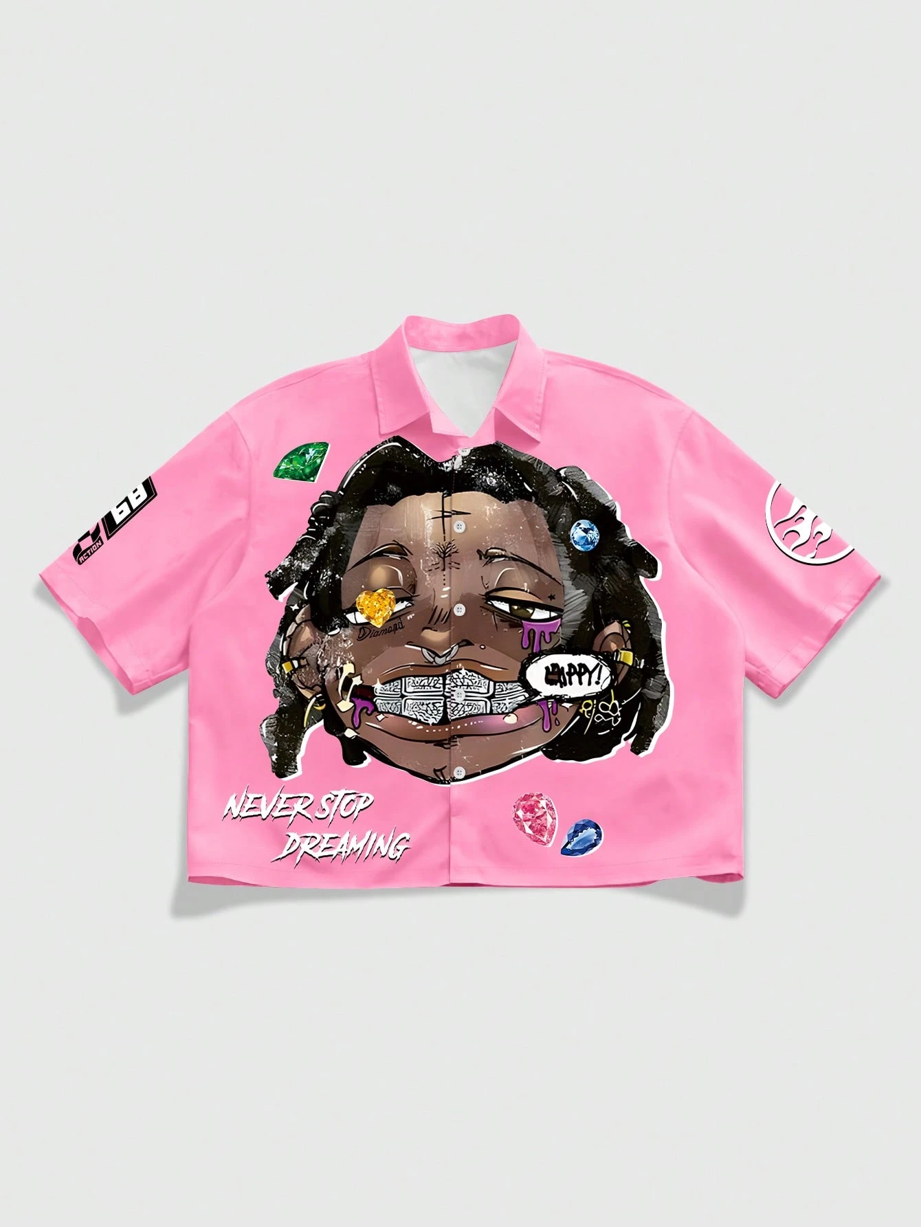 Street Life Herren Slogan & Figur Muster Kurzarm Hemd mit Einzelknopfleiste für den Sommer