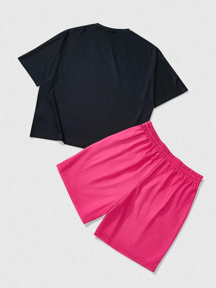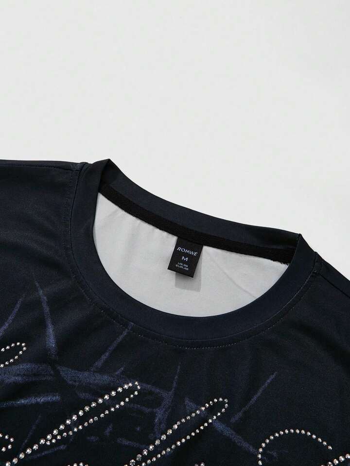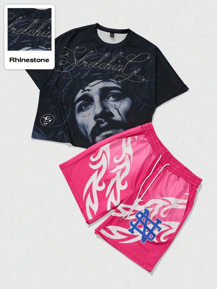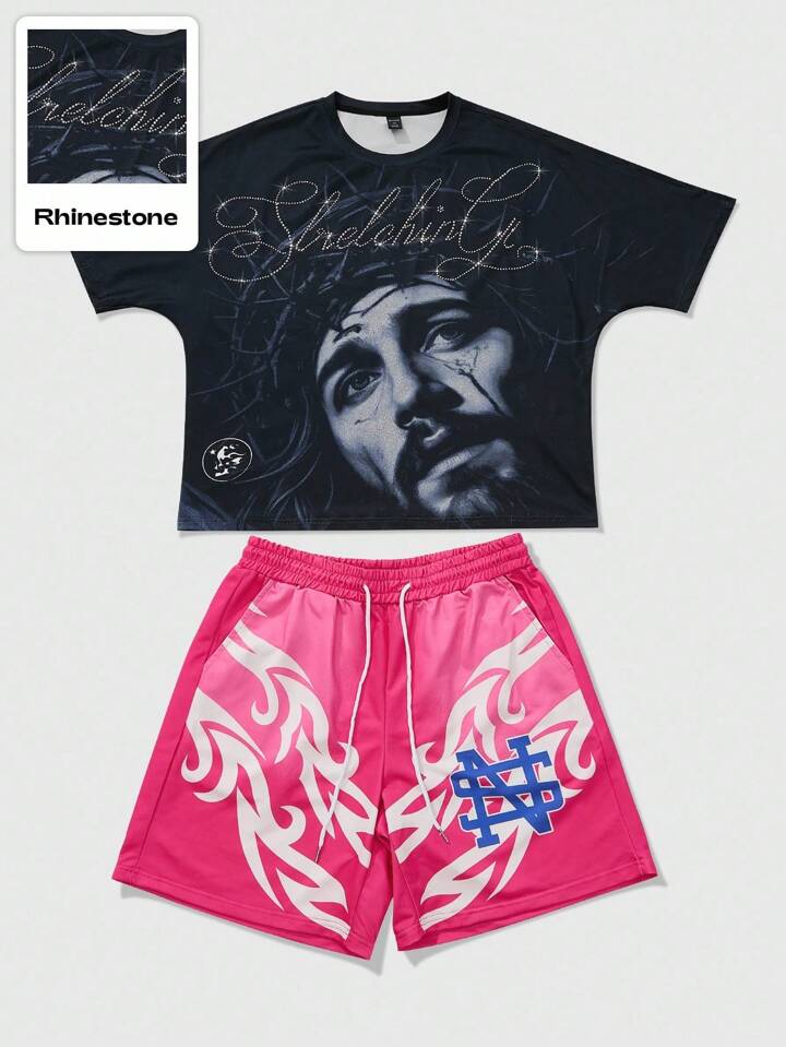 Street Life Herren Streetwear American Jesus T-Shirt Set mit Strass-Grafik-Muster, Kurzarm