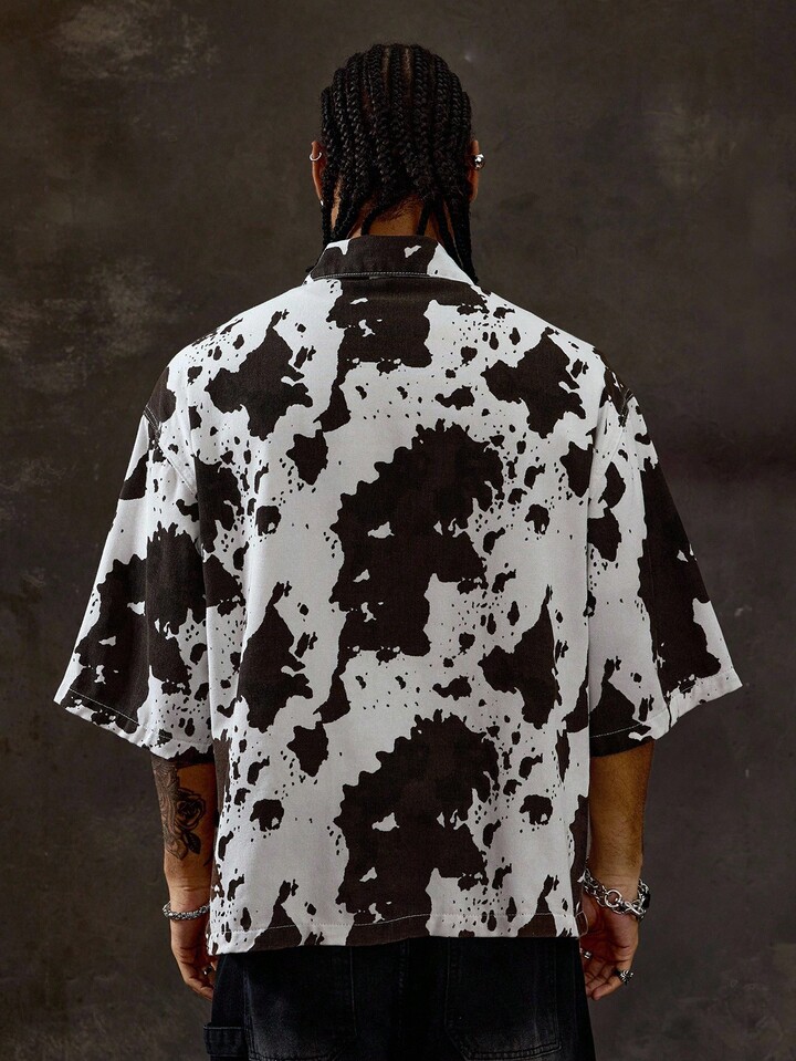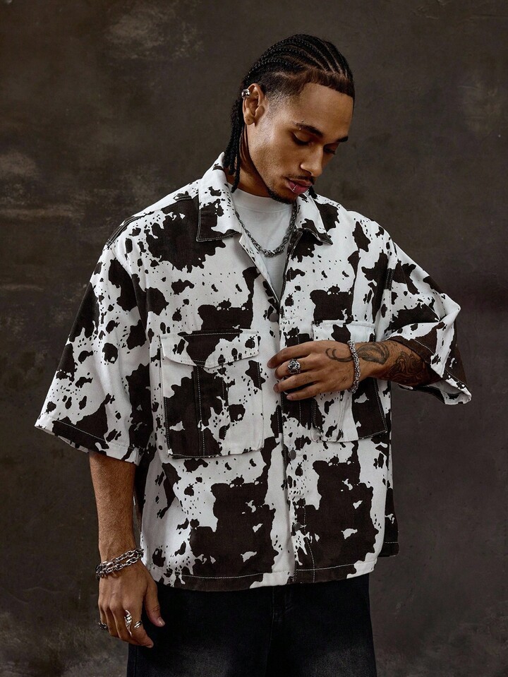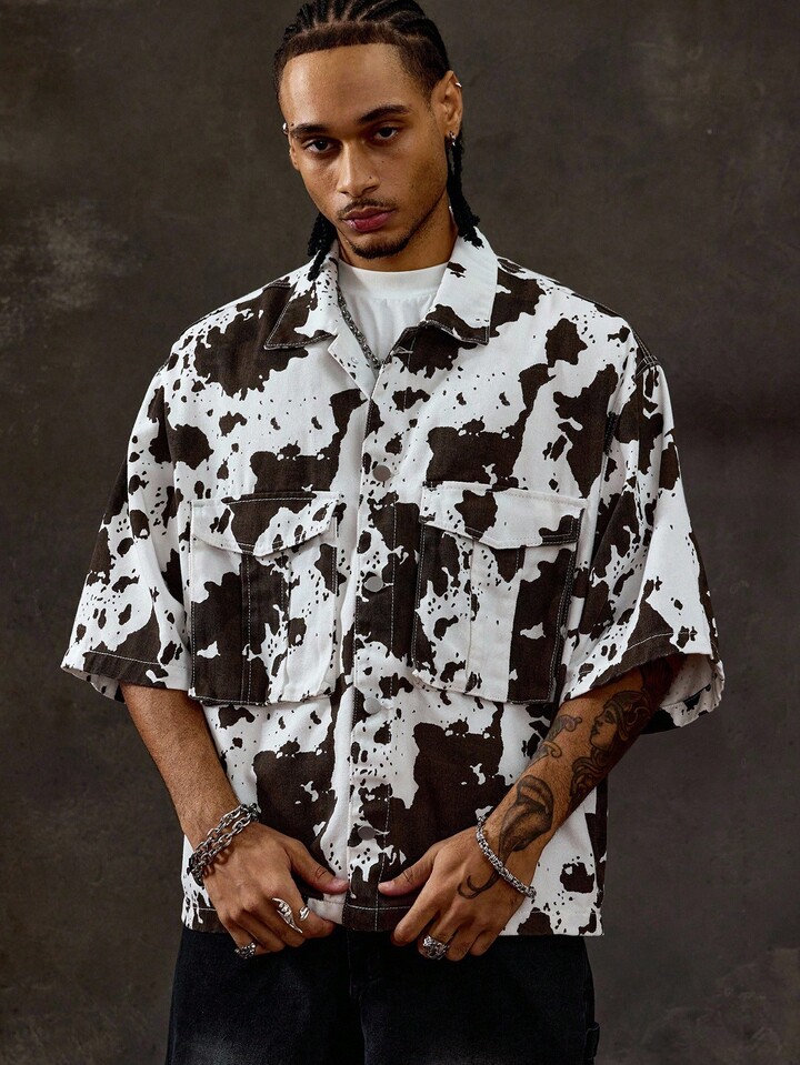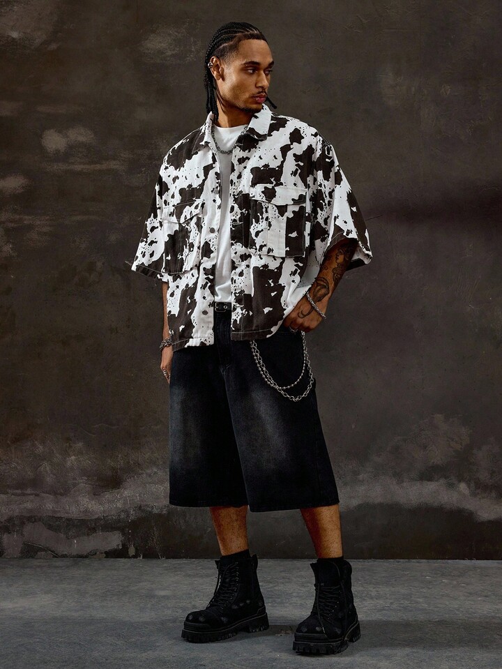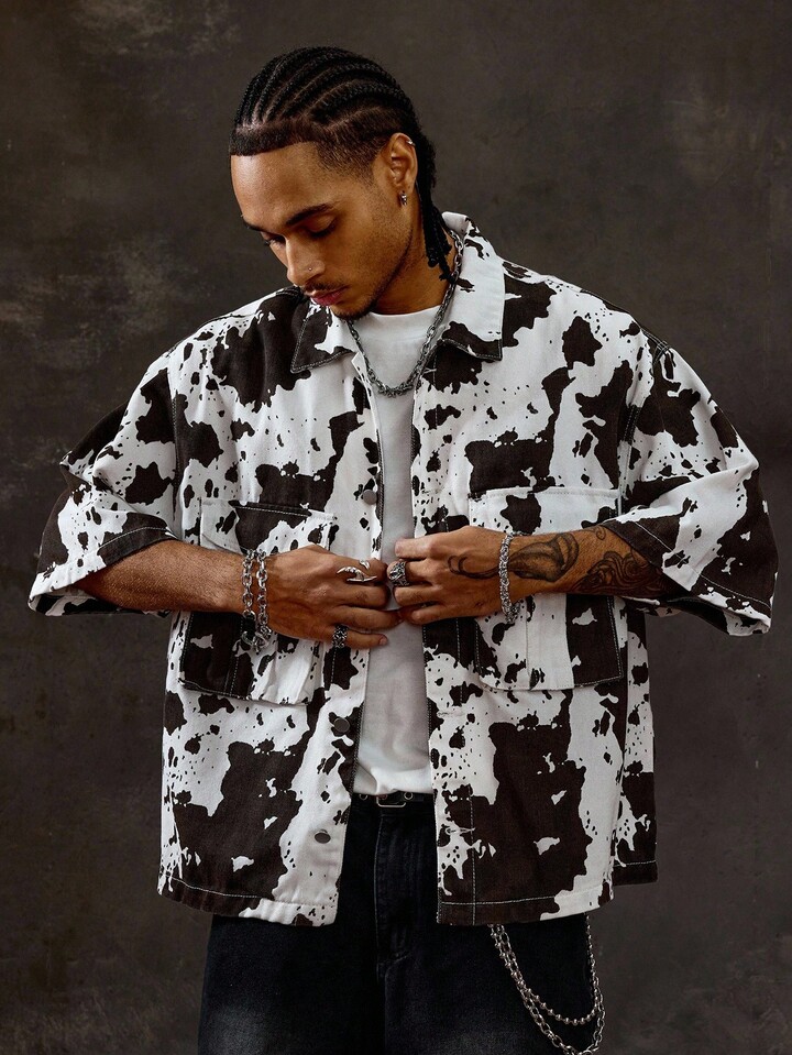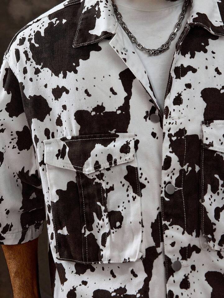 Street Life Herren Sommer Kuh-Muster Kurzarm Einreiher Lässig Denim Hemd mit Taschen