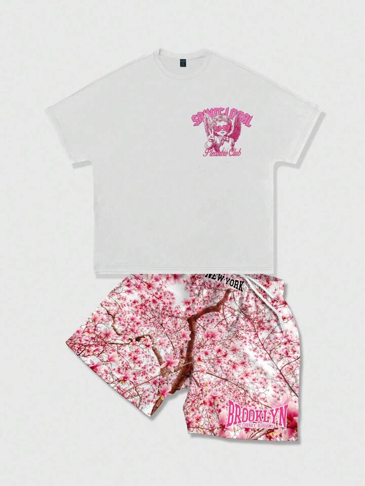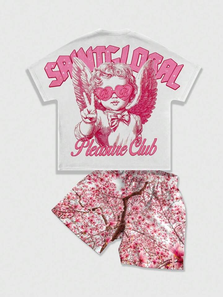 Street Life Herren Sommer Street Style Set aus Engel- & Buchstaben-bedrucktem Fledermaus Kurzarm T-Shirt und Shorts, Halloween
