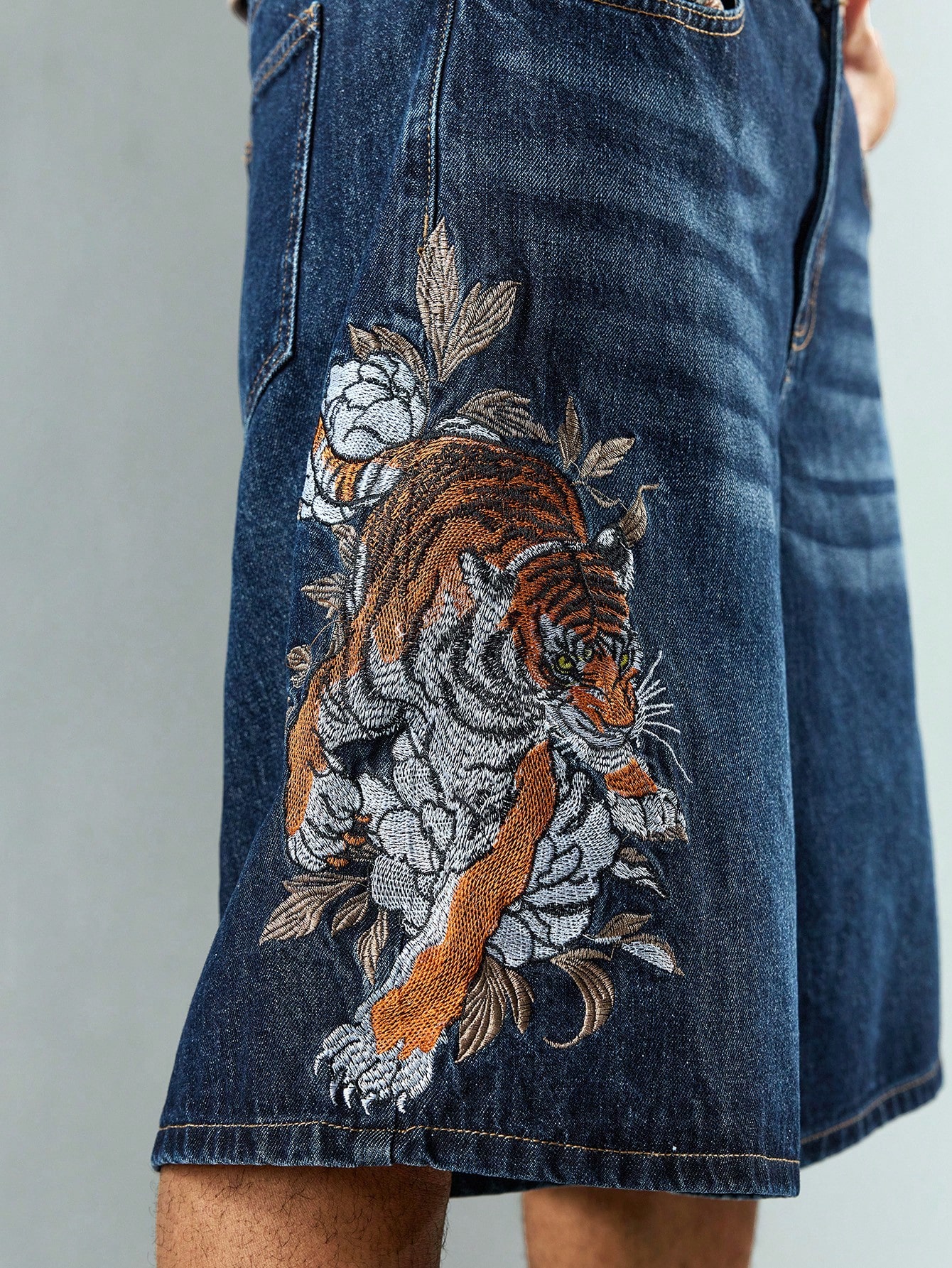 Street Life Herren Lässig Jeans Shorts mit Tiger Stickerei