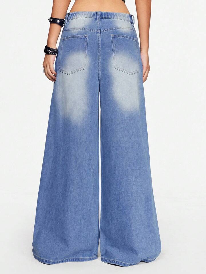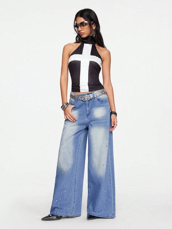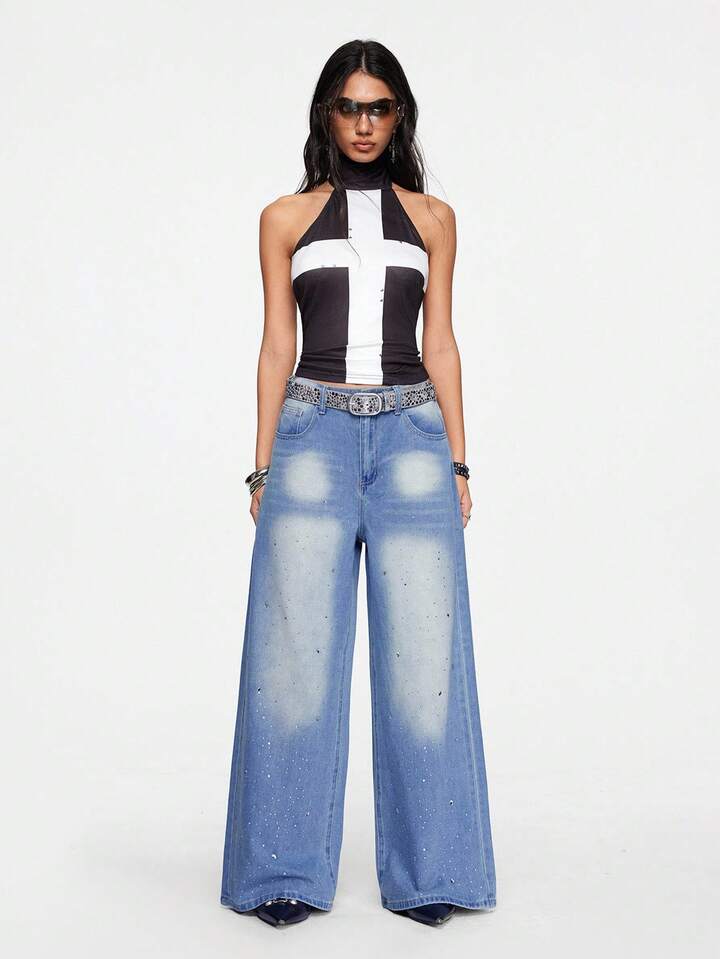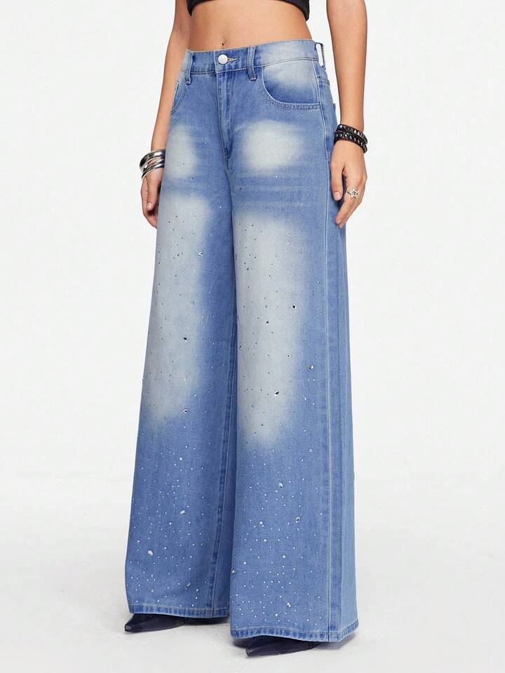 Street Life Damen Lässig Everyday Jeans mit weitem Bein und gewaschenen Strass-Verzierungen