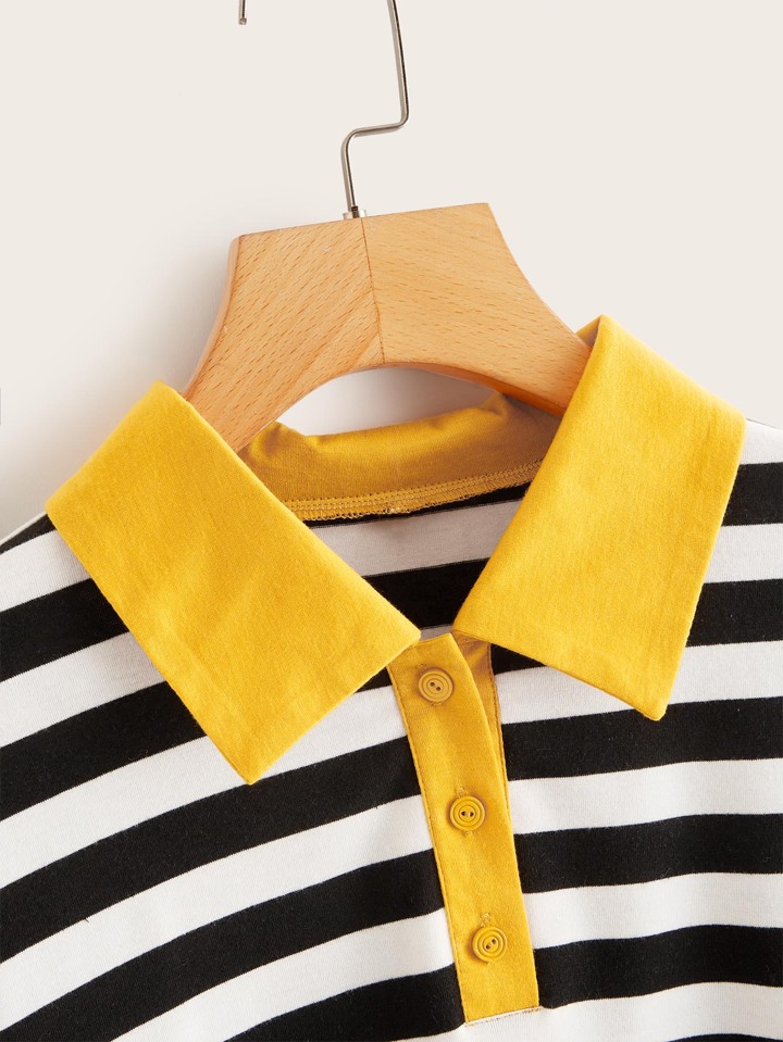 Crop T-Shirt mit Streifen, Kontrast-Kragen und halber Knopfleiste