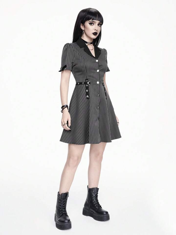 Gestreiftes Punk Gothic Stil Metall Ösen Knöpfe Kragen A-Linie Kleid für Frauen