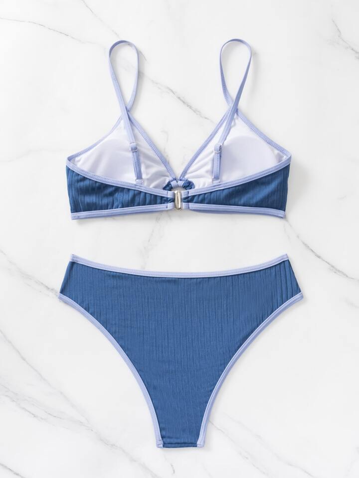 Geripptes Bikini Set, kontrastierender Bindungsring, verbundener BH und Bikini Unterteil, 2 teiliger Badeanzug