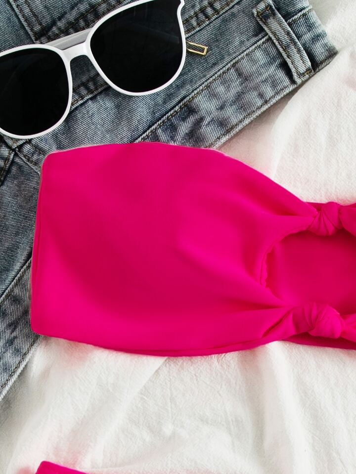 Einfarbiges Bikini Set mit Knoten Dekor, Bandeau Top und Unterteil mit hoher Ausschnitt, zweiteiliger Badeanzug