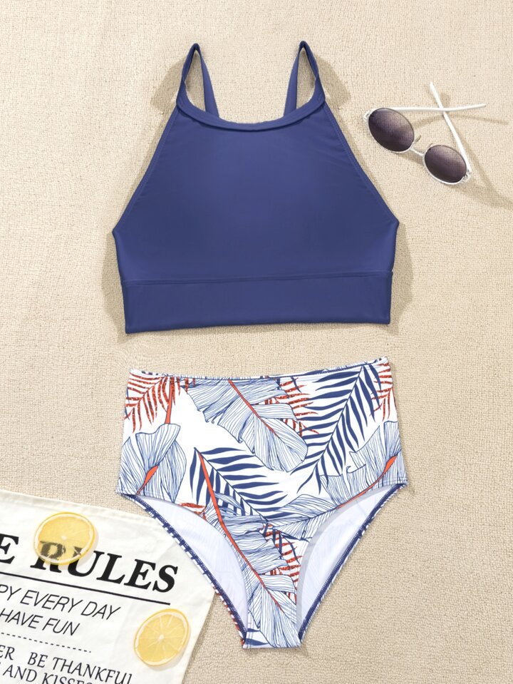 Tankini Set mit tropischem Muster, Halter, 4 Wege elastisches Rücken Top und hoch taillierter Unterteil, 2 teiliger Badeanzug