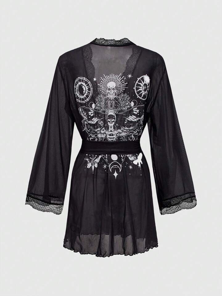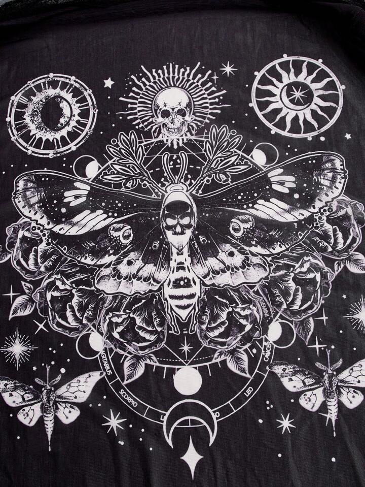 Goth Sommergotik Mond, Sterne, Motte, Schmetterling, Schädel und Mesh Muster Patchwork Wimpernspitze Kimono
