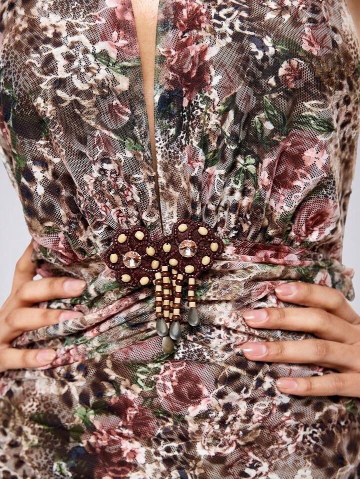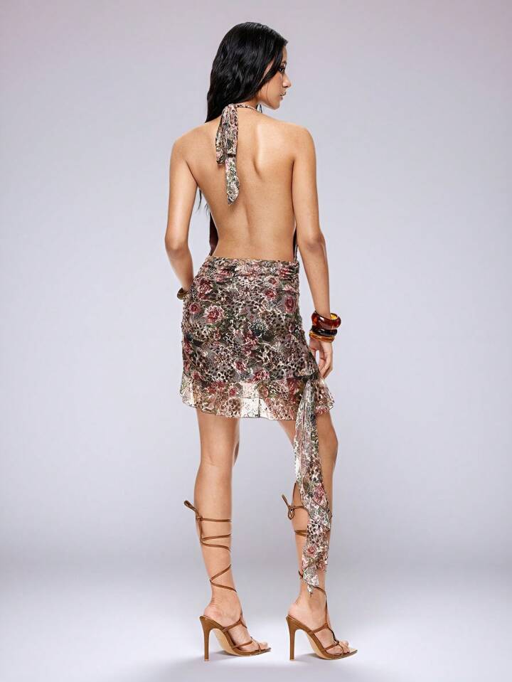 Grunge Punk Sommer Frauen Y2K wilde Mädchen Leopard Blumen Spitzen Muster Urlaub Neckholder V-Ausschnitt Mini Kleid