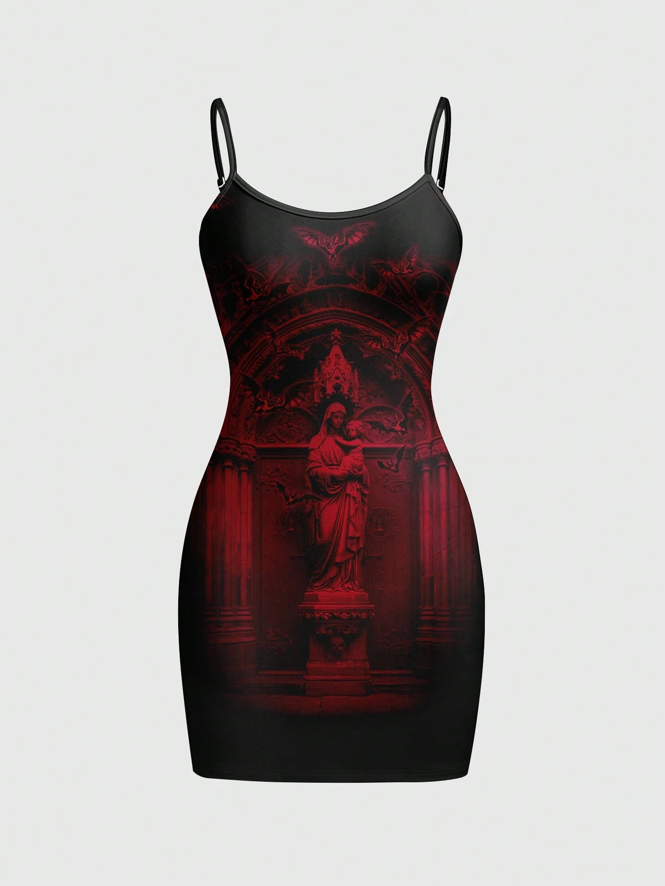 Goth Gotischer Kirchen-Dunkel-Jungfrau-Tiefer-Ausschnitt Fledermaus & Motte Sexy Vintage Dunkel Muster Camisole Bodycon Mini Kleid für Frauen