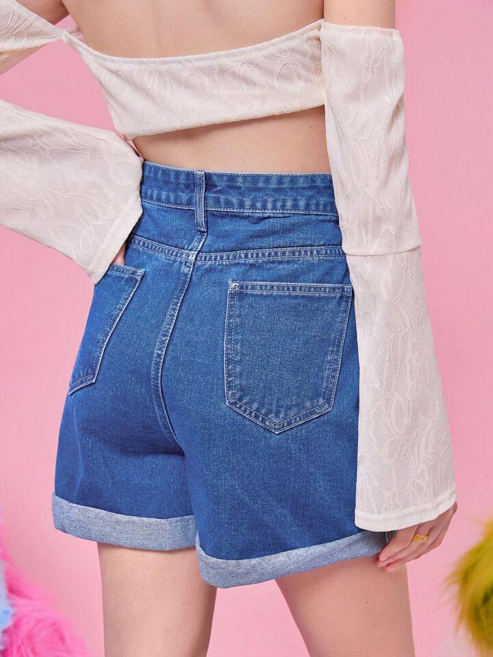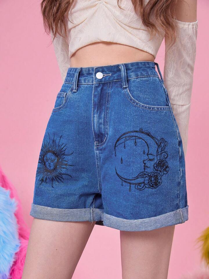 Denim Shorts mit Sonne & Mond Grafik