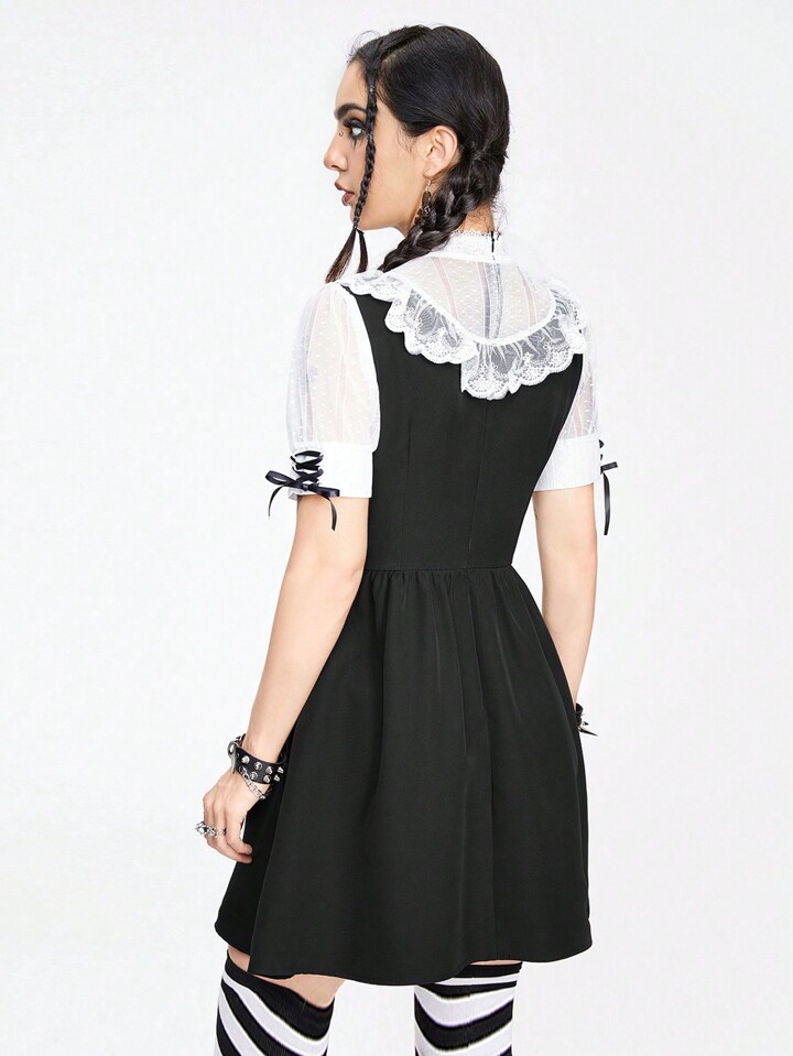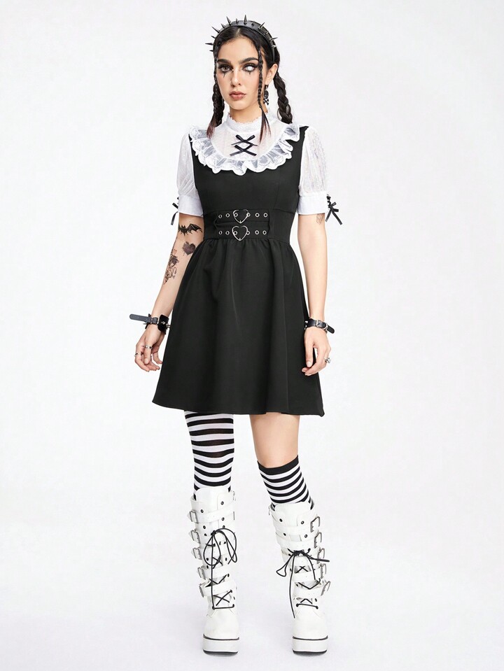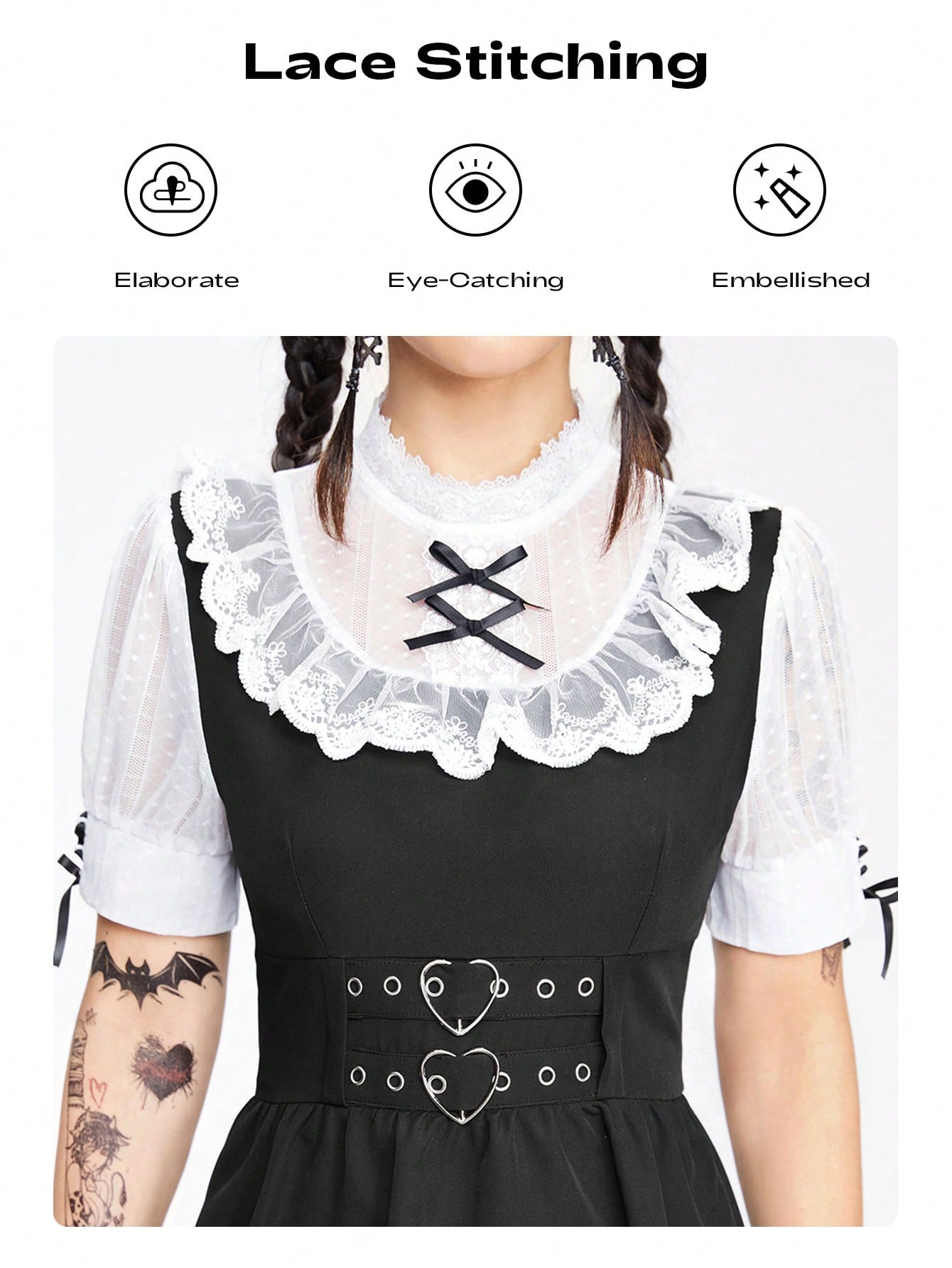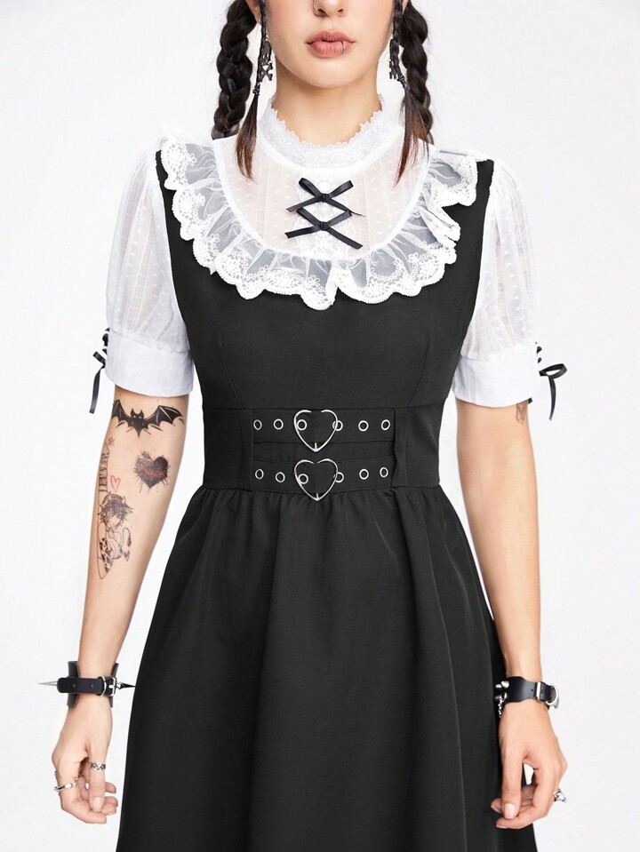 Süßes Kleid im Gothic-Stil mit Farbblock-Design, Spitzenlagen und Rüschen-Saum mit Schleifendetails und herzförmiger Schnalle, Taillen-Design für Frauen