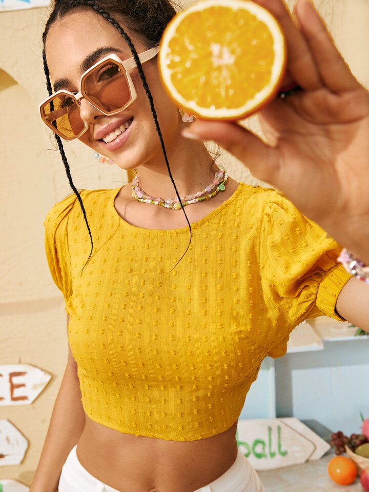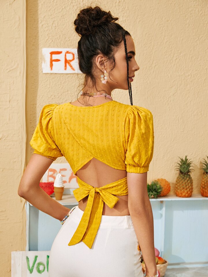 Crop Bluse mit Punkten Muster, Puffärmeln, Band hinten,