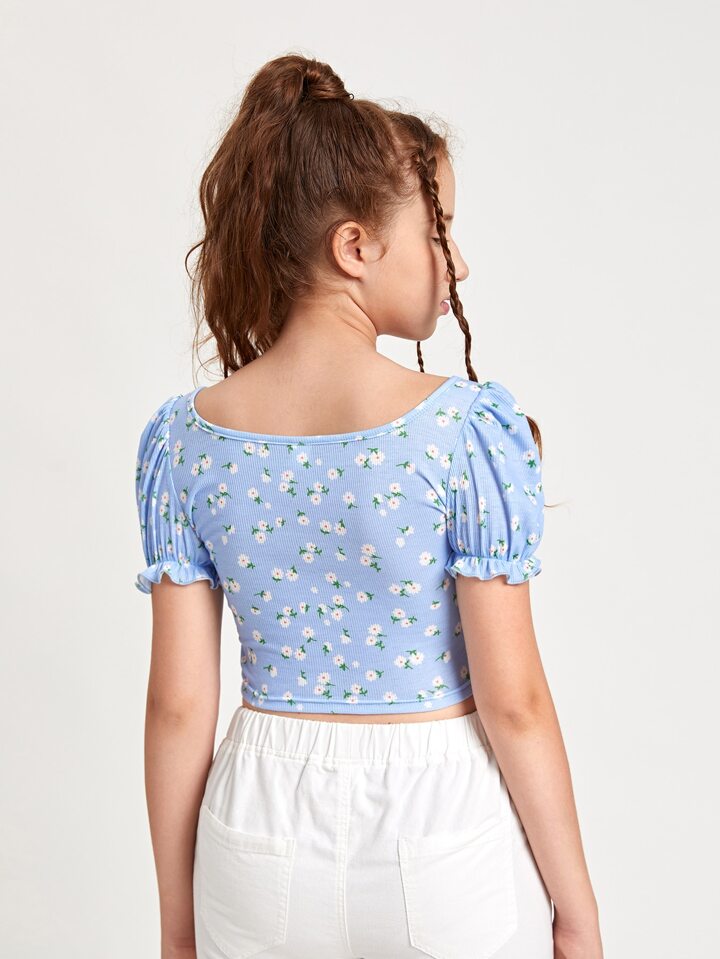 Teen Mädchen Rippenstrick T-Shirt mit Blümchen Muster, Band vorne