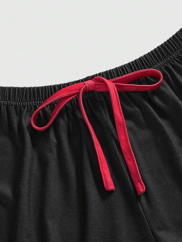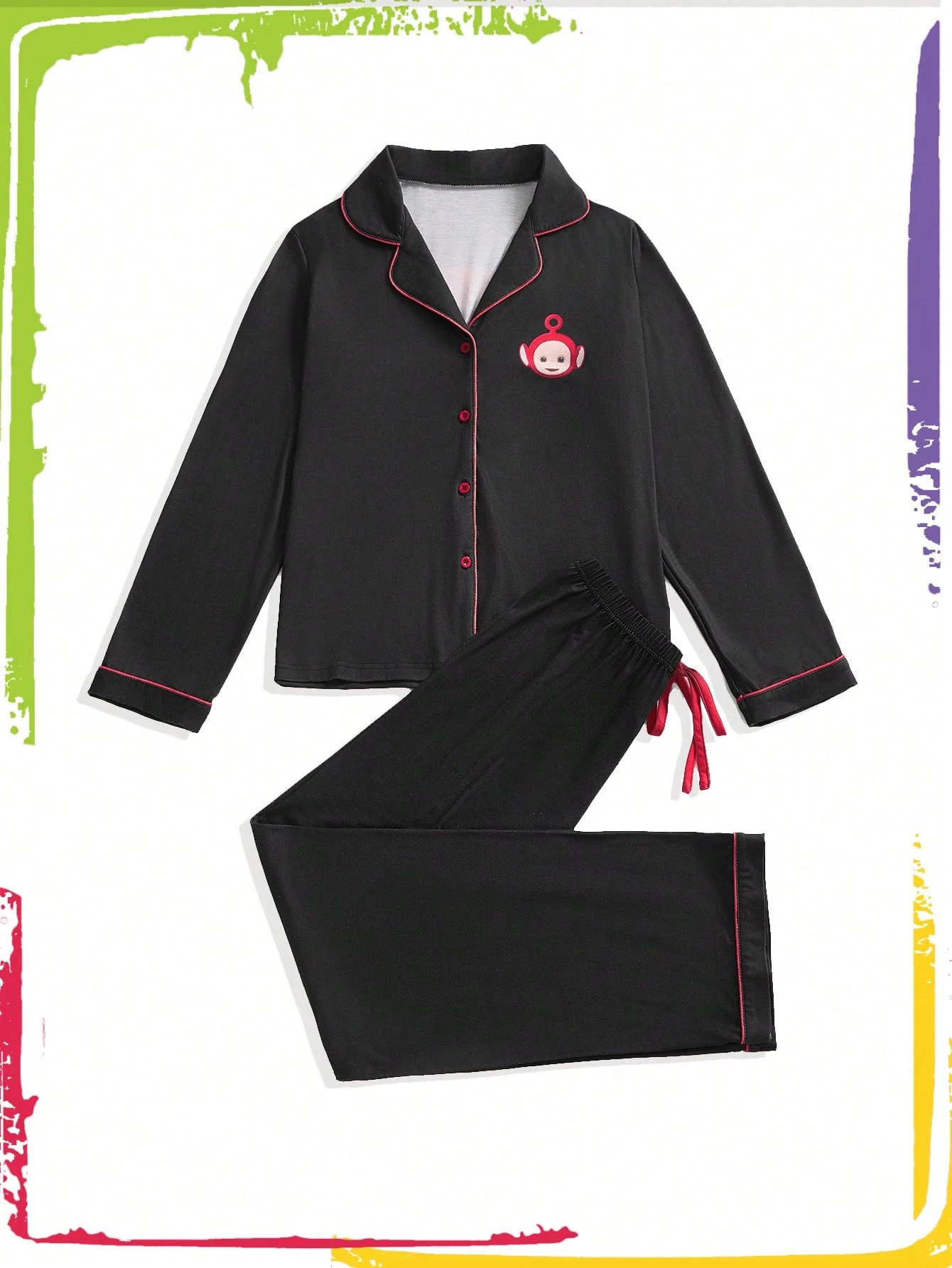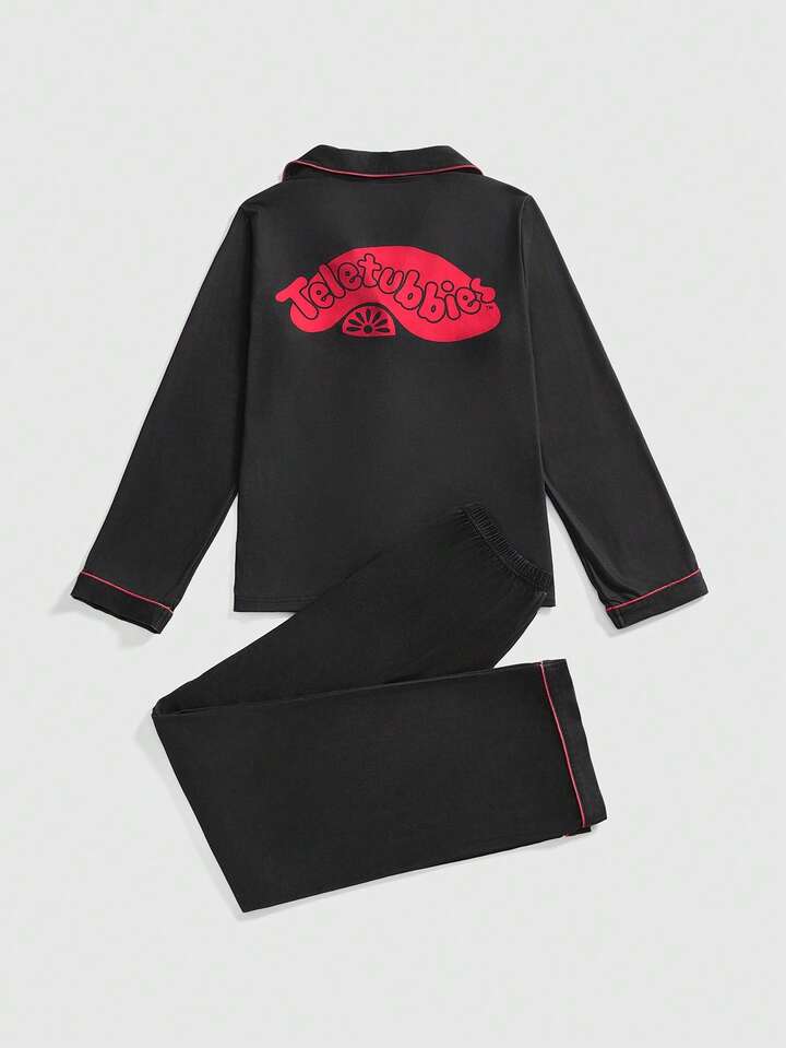 Teletubbies X ROMWE Süßer Kontrastsaum Cartoon-Muster Knopfleiste Langarm-Top und Hose Pyjama-Set, Herbst- & Winterkleidung