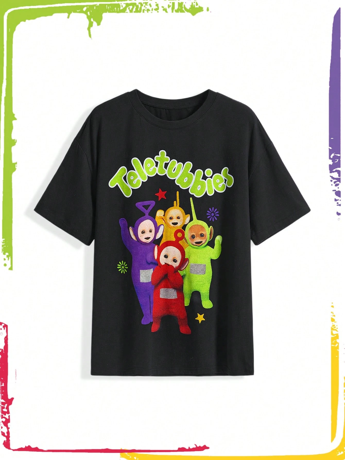 Teletubbies X ROMWE Damen süßes, lässiges T-Shirt mit Buchstaben- und Cartoon-Muster, Kurzarm, Sommer