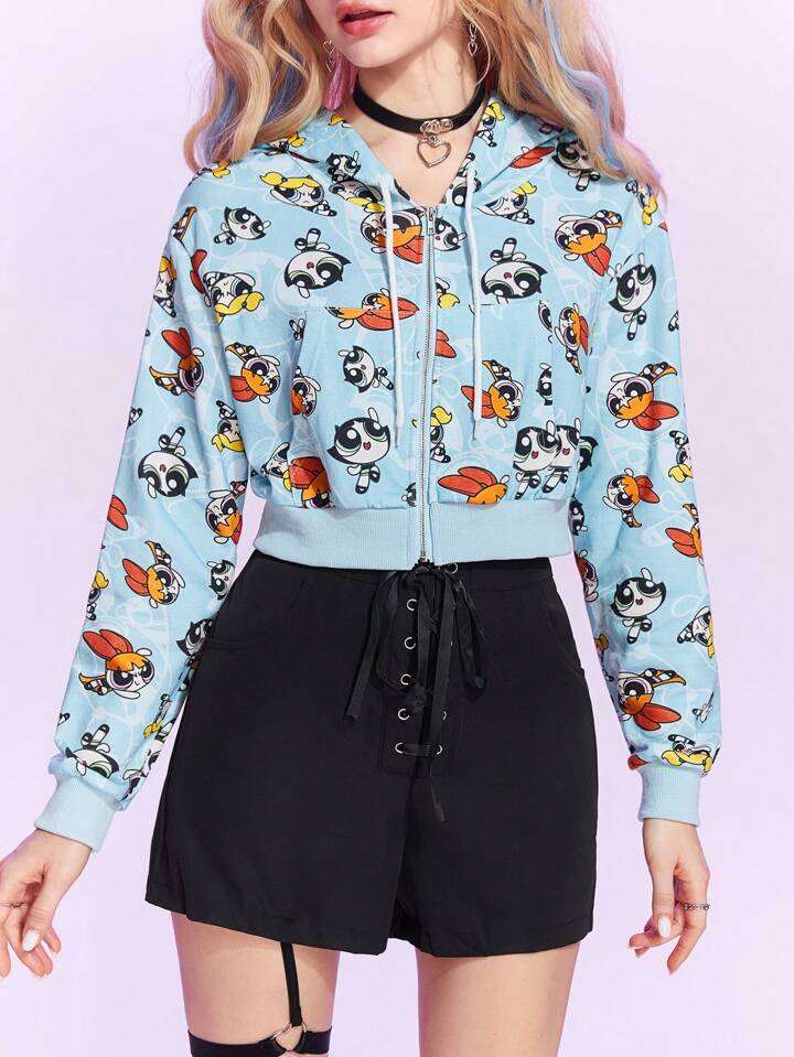 The Powerpuff Girls | ROMWE Crop Hoodie mit tief angesetzter Schulterpartie und Cartoon Grafik