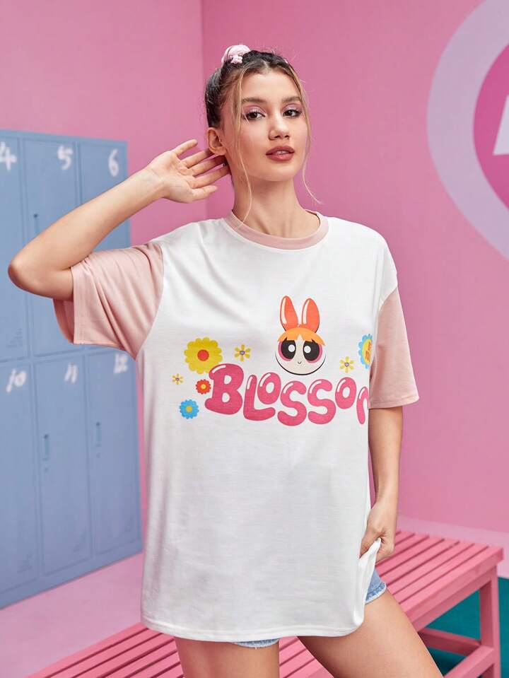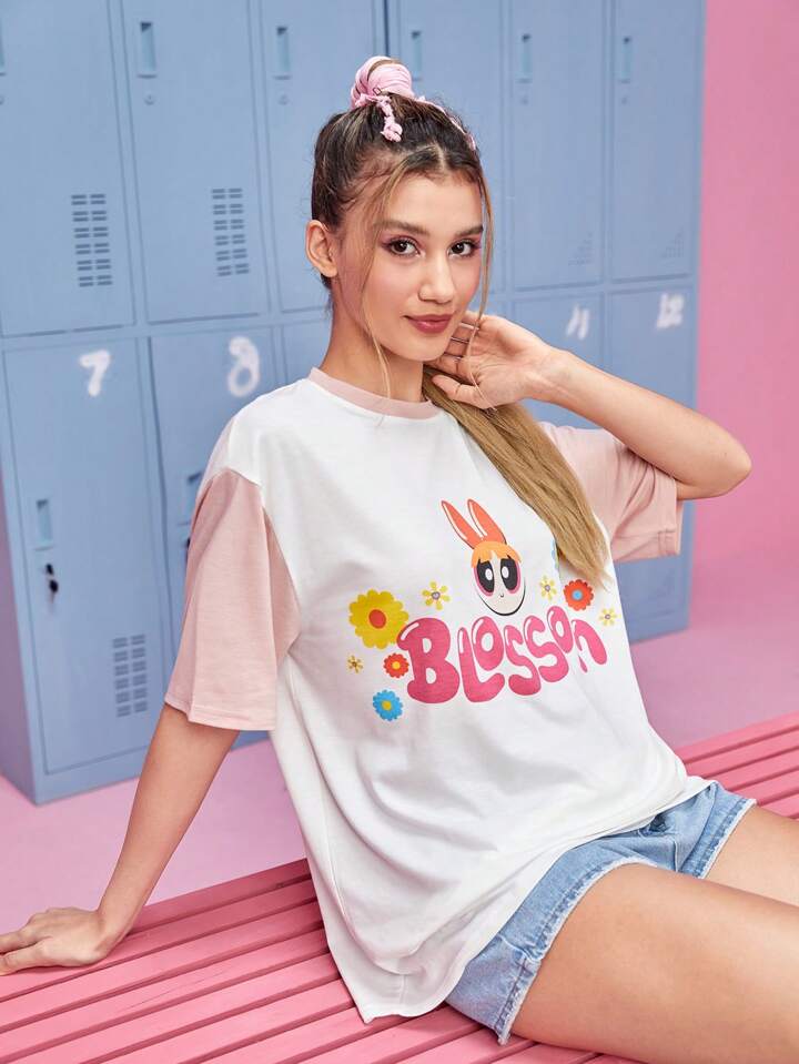 The Powerpuff Girls | ROMWE Drop Shoulder T-Shirt mit Cartoon & Buchstabe Grafik,