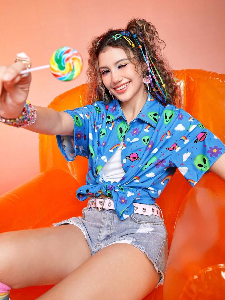 ThisUniqueVibe Kawaii Hemd mit Knopfleiste vorne und Alien Aufdruck
