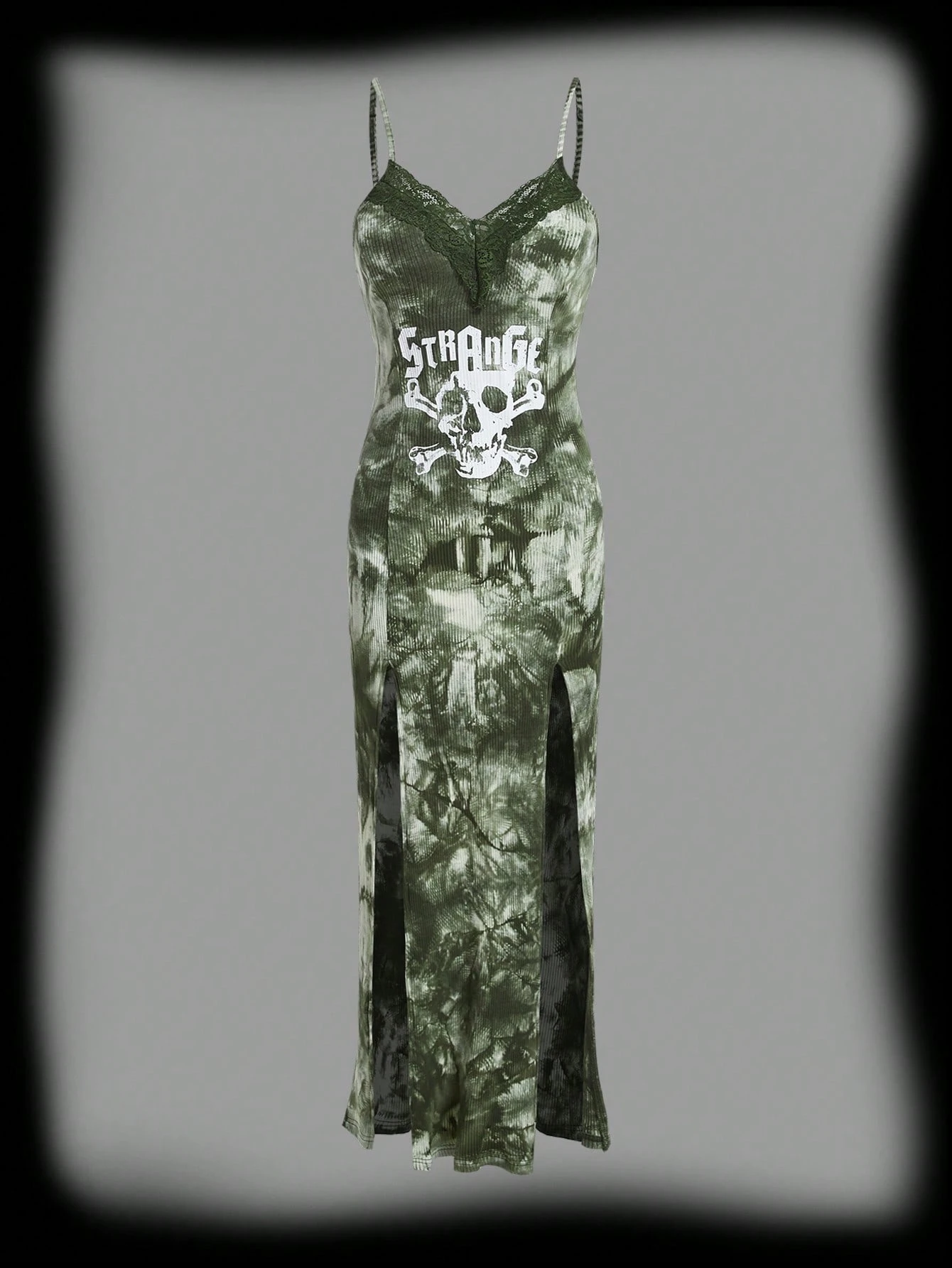 Cami Kleid mit Batik, Schädel & Buchstaben Grafik, Schlitz,