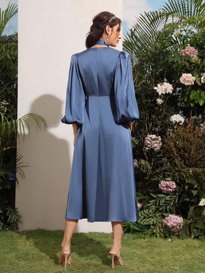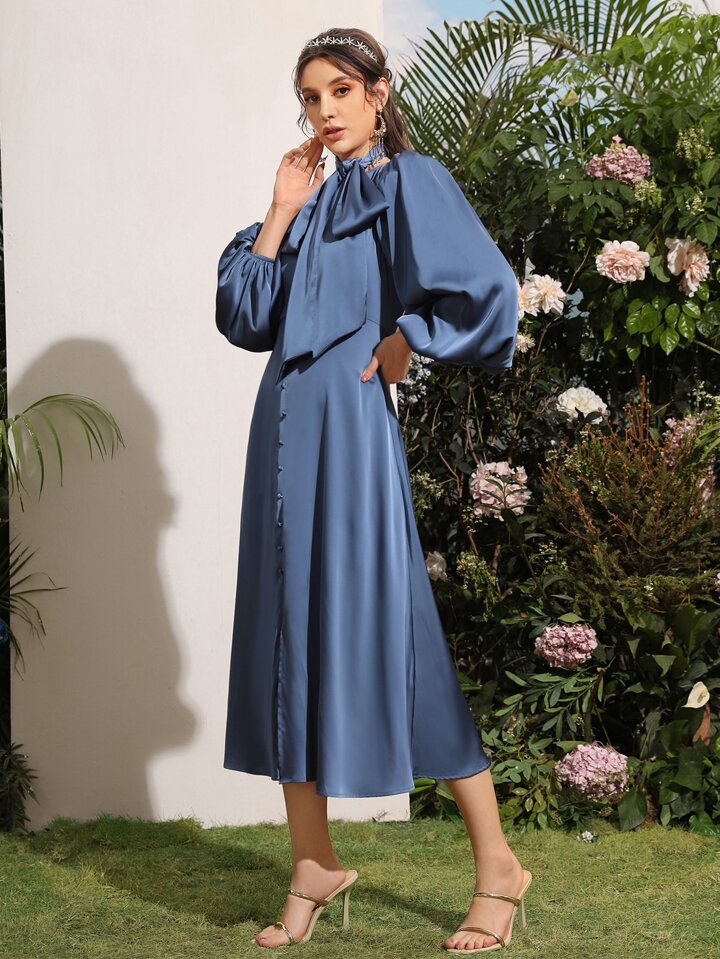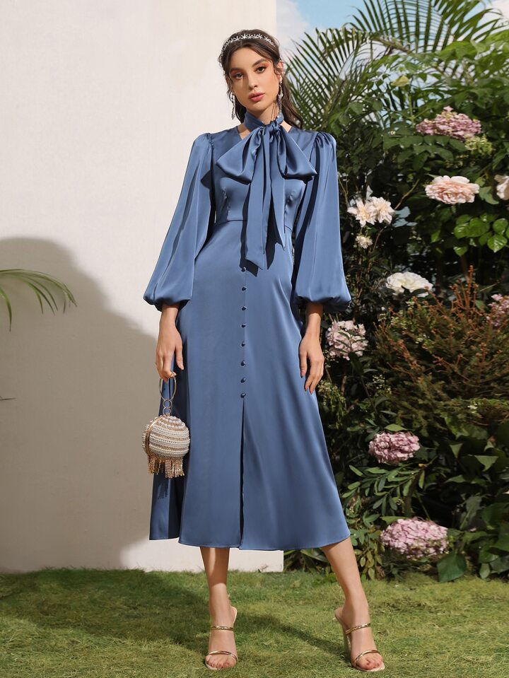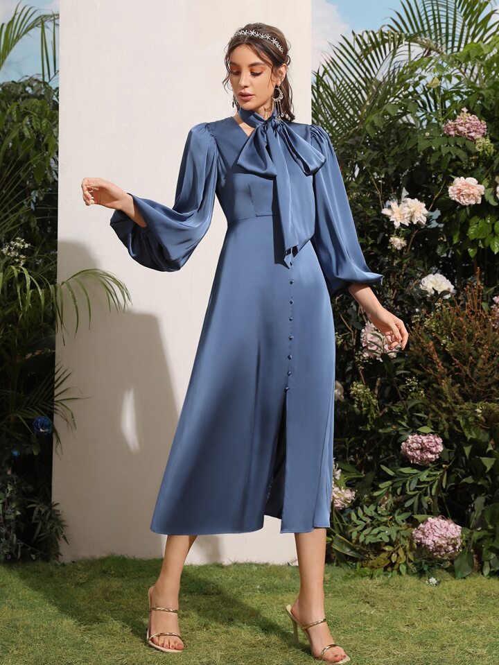 Kleid mit Schleife am Ausschnitt, Laternenärmeln, Knopf vorne