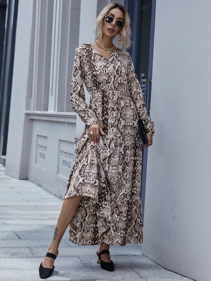 Kleid mit Schlangenhautprint, Rüschensaum und Schleifen-Kragen