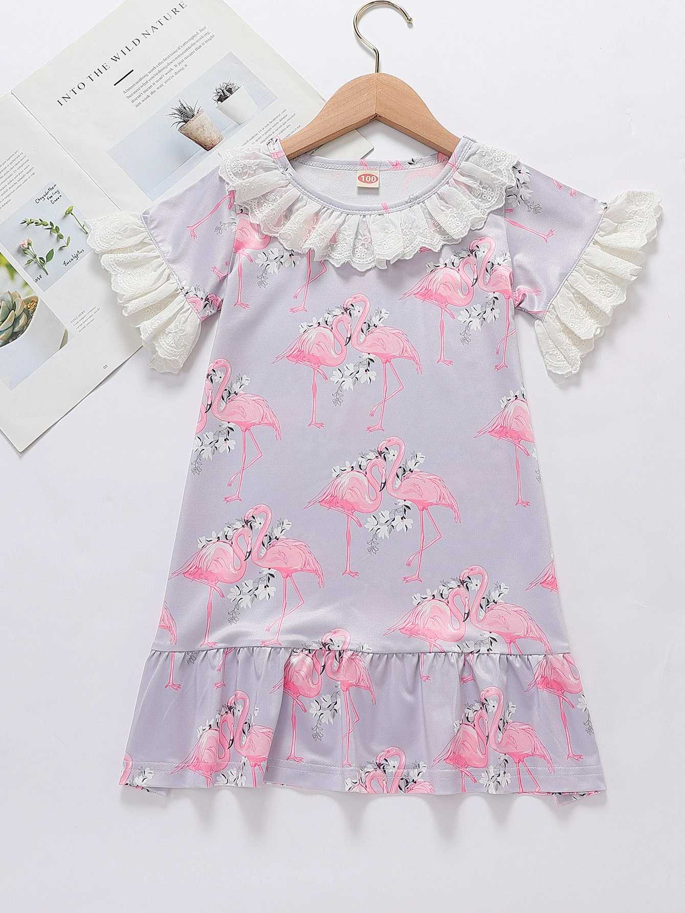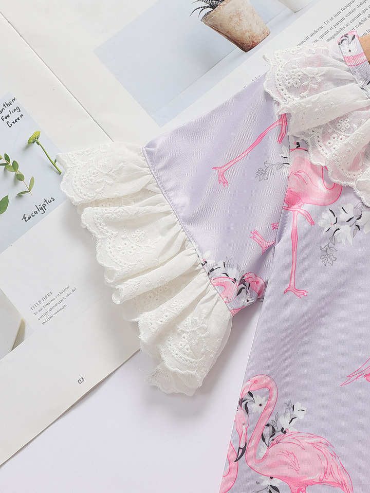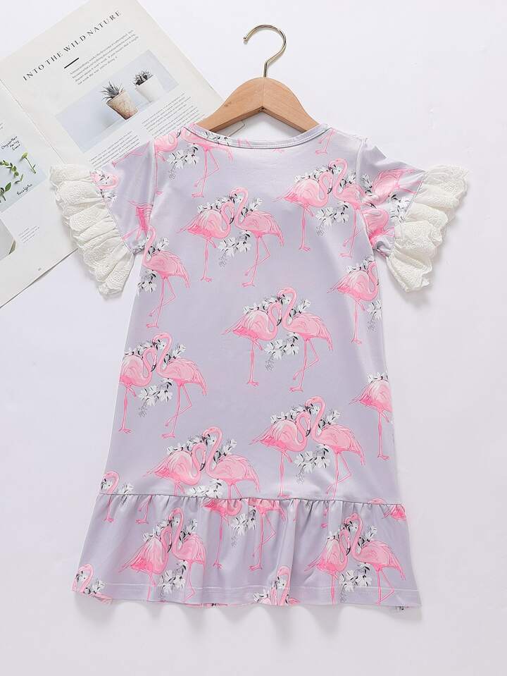 Kleinkind Mädchen Lounge Kleid mit Flamingo Muster und Kontrast Öse Stickerei