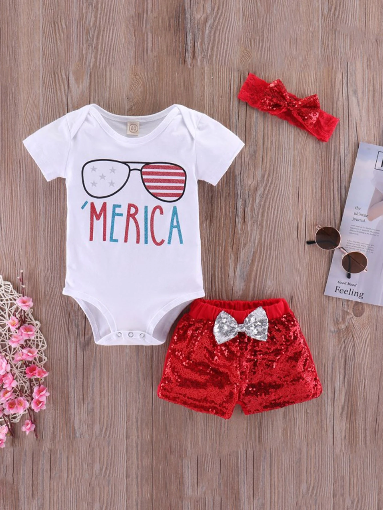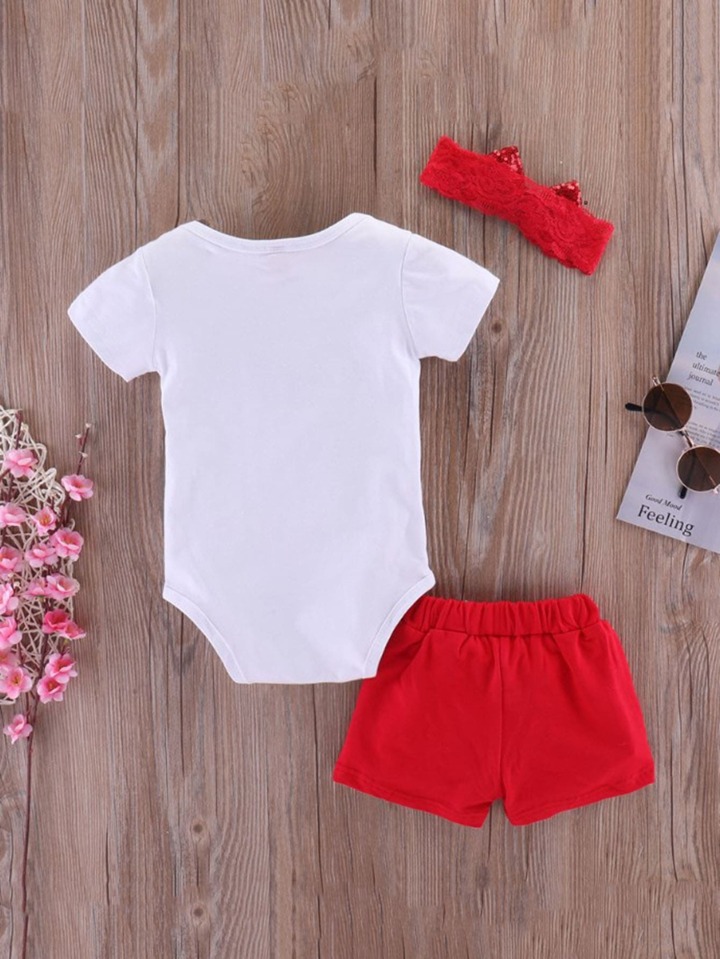 Mädchen Jumpsuit mit Buchstabenmuster, Pailletten Shorts mit Schleife und Stirnband