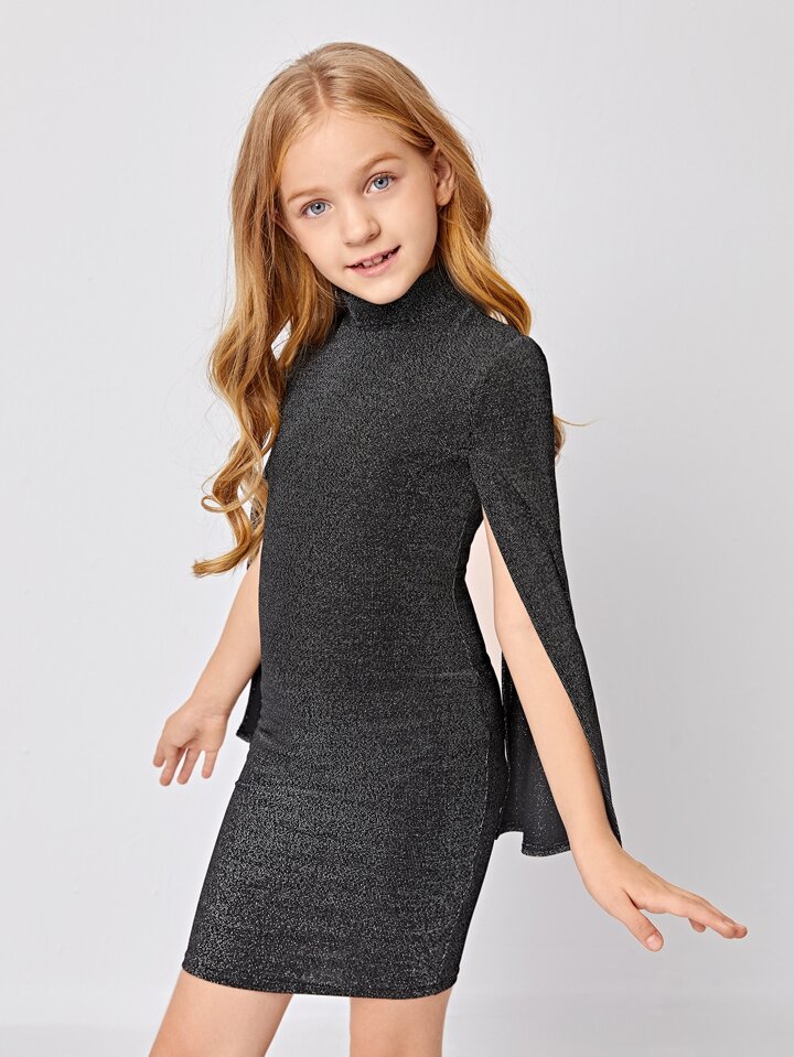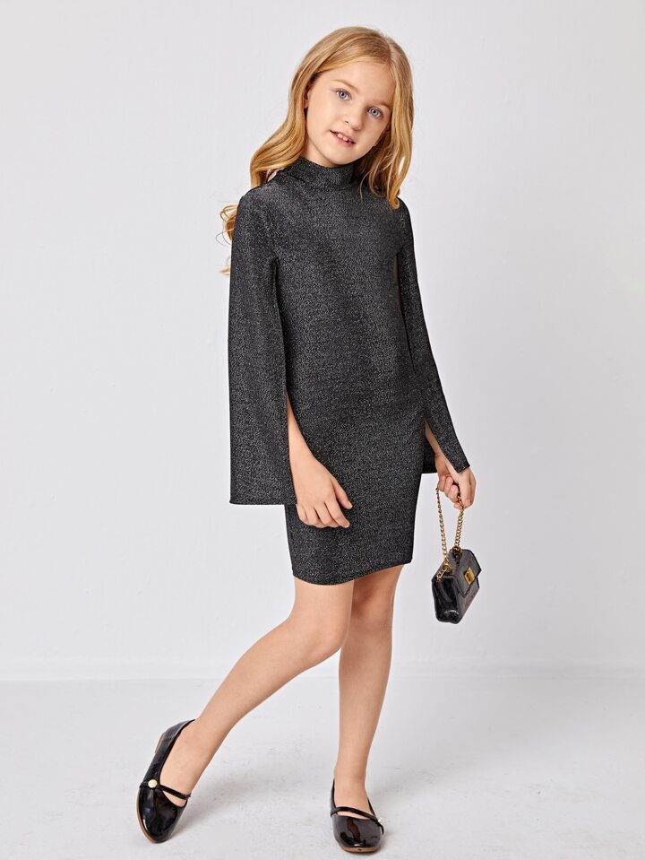 Tween Mädchen Glitzerkleid mit Stehkragen und Umhangärmeln
