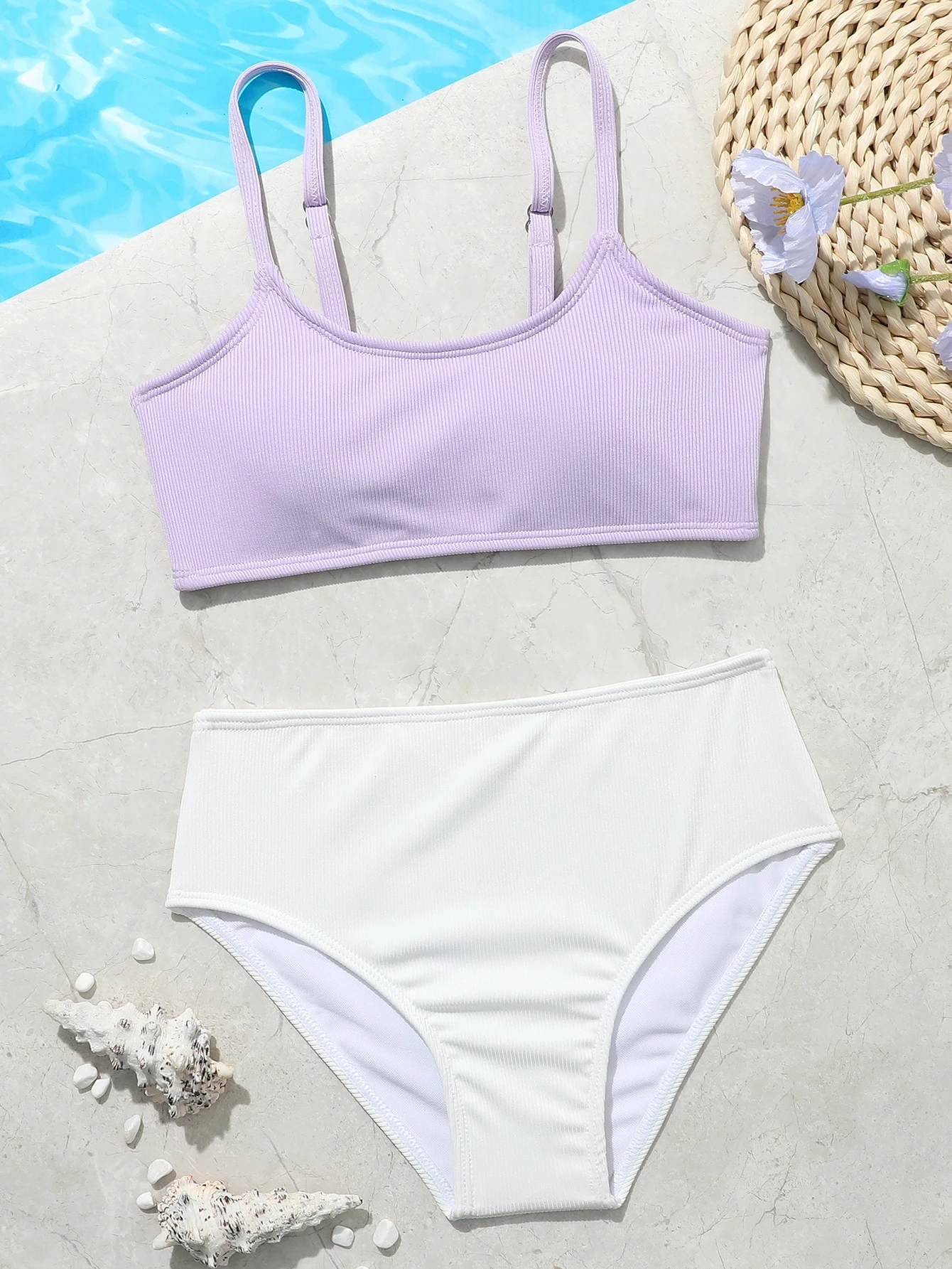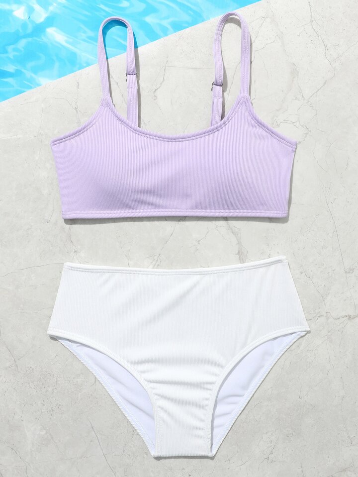 Zweifarbiger Rippmaterial Bikini Set für Tween-Mädchen, Sommer Strand