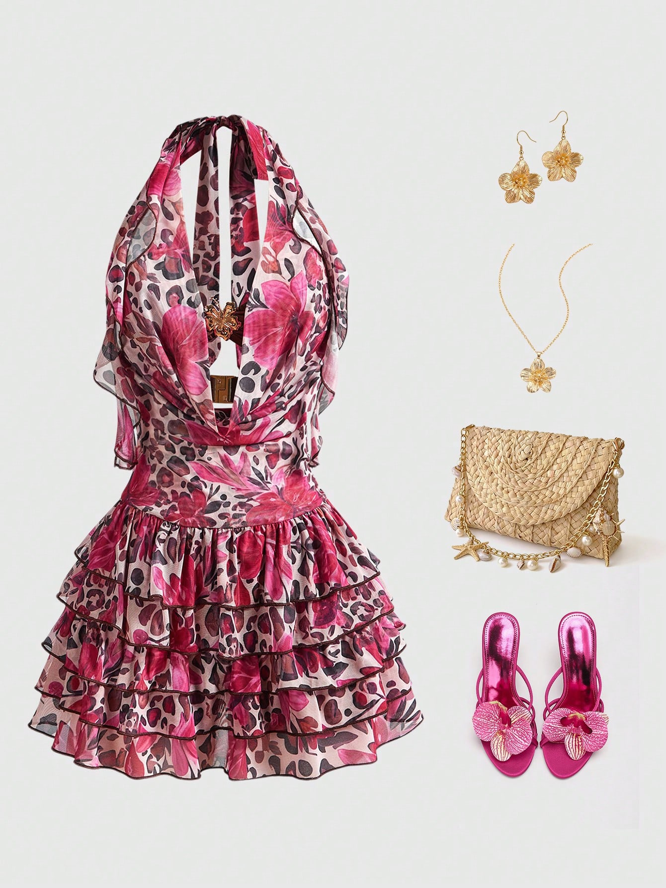 Urlaubsstil Leopard Blumen Muster Rüschen Kragen Mini Lagen Sexy Kleid