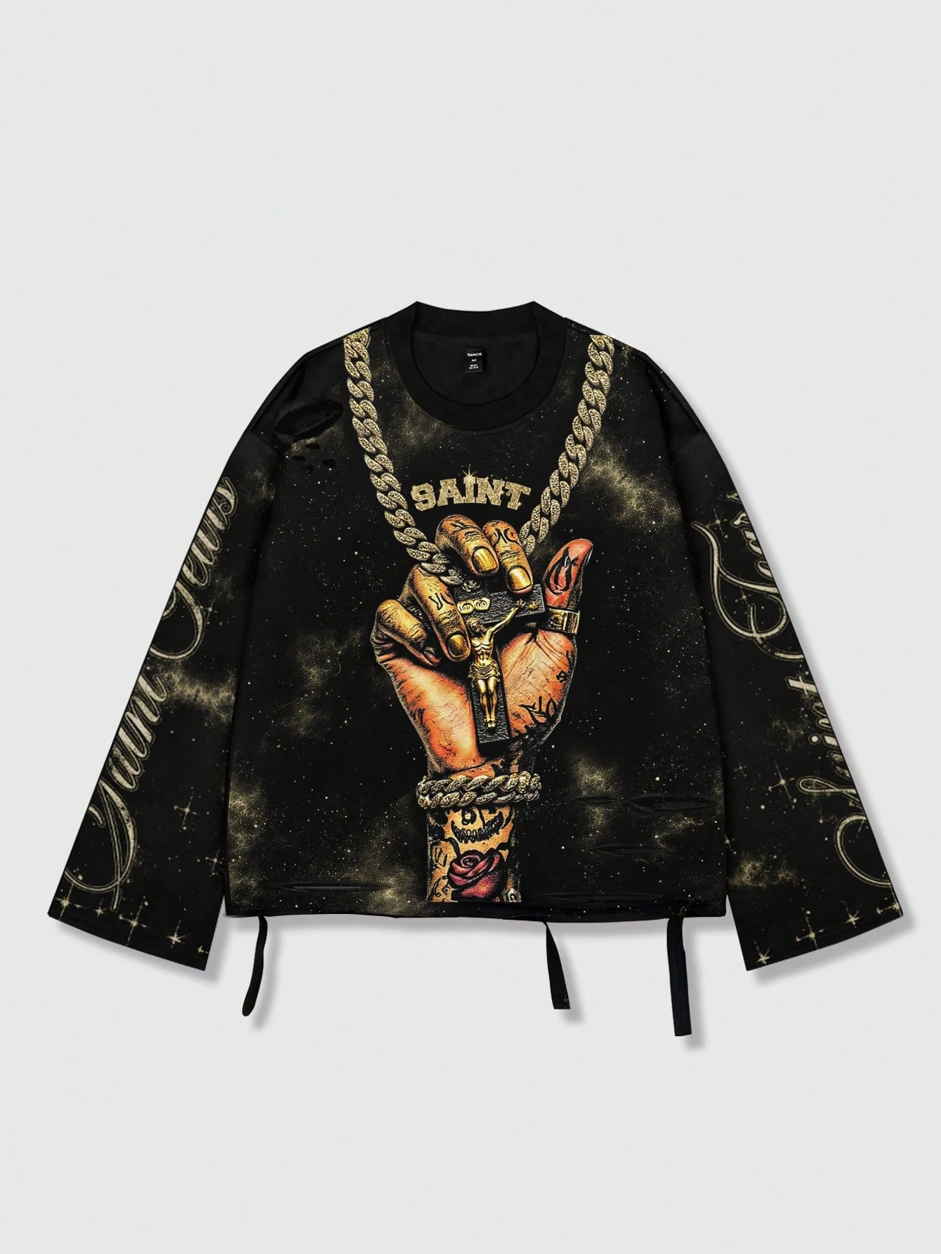 Street Life Vintage Streetstyle verwaschenes Saint Grafik Langarm Rundhals Herren T-Shirt