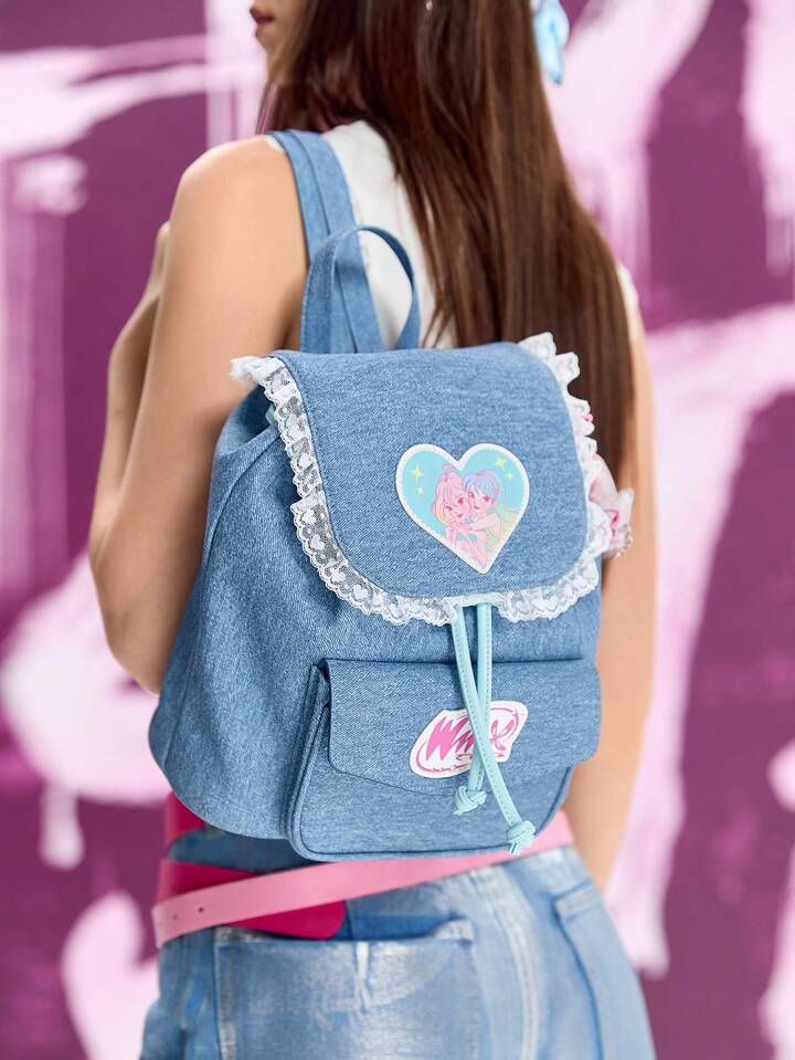 Winx Club X ROMWE Cartoon-Buchstaben-gepatcht Spitzentrimm Multi-Funktions Reißverschluss Tasche Modisch Jeans Rucksack
