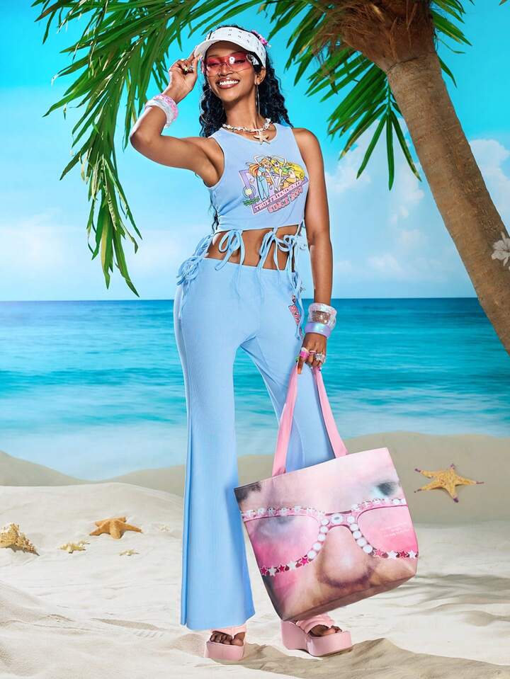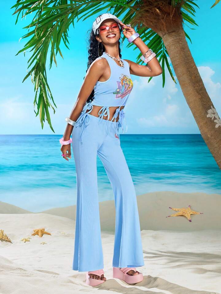 Winx Club X ROMWE Damen 2-teiliges Set mit Cartoon-Grafik, Rundhals-Knoten Crop Top und Hose