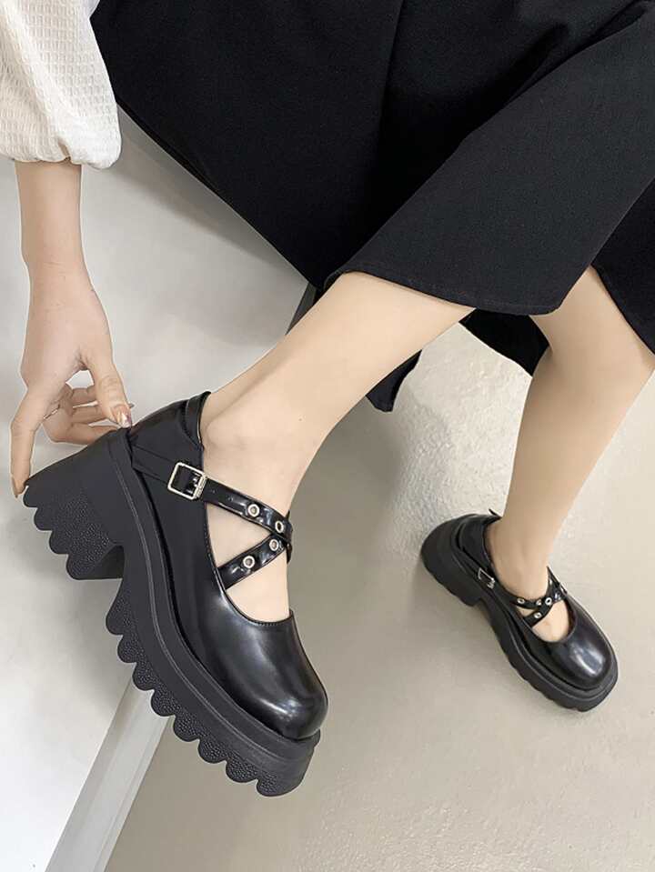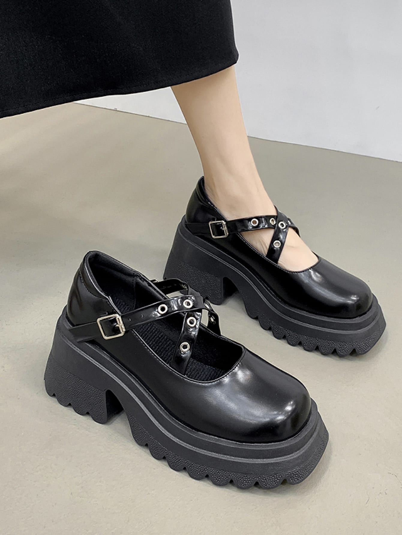 Criss Cross Plateauschuhe mit Ösendetails für Damen, modische schwarze Mary Jane Schuhe mit Plateausohle für Outdoor