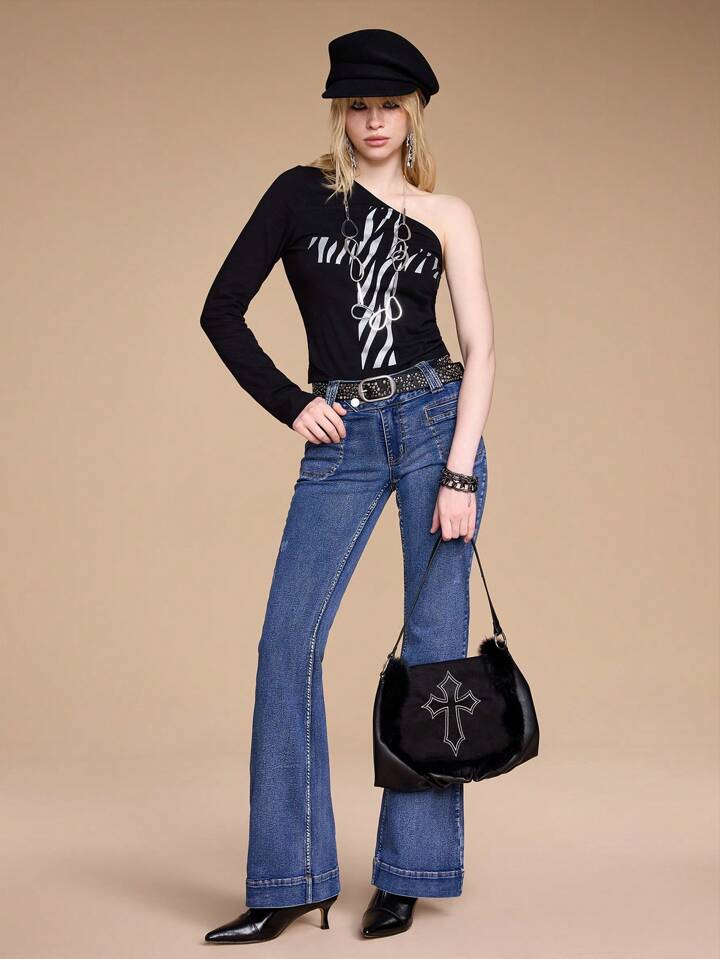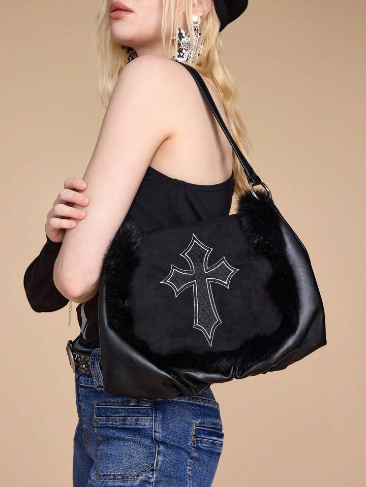 Damen Gothic Dark Wildleder flauschige bestickte Kreuz Dekor Umhängetasche, Herbst/Winter